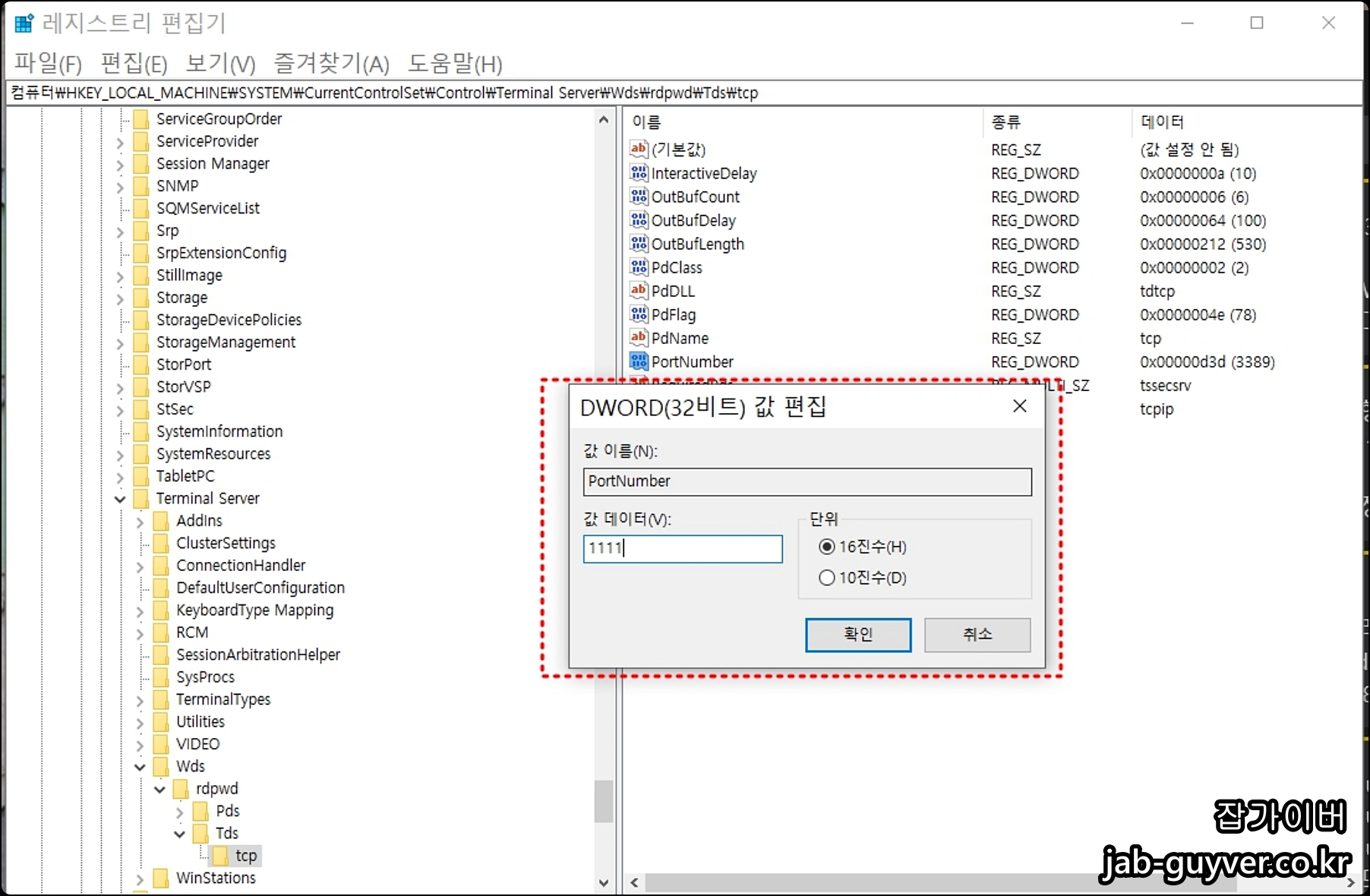 예를들어 기존의 3389 포트를 1111로 포트번호를 변경합니다.