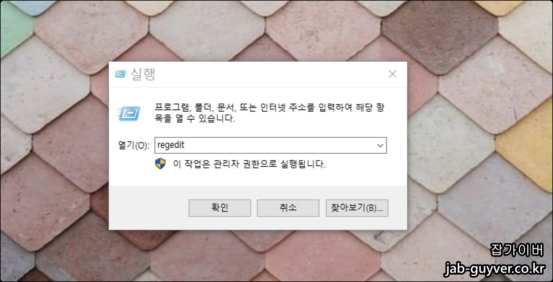 윈도우 실행에서 레지스트리 편집기를 실행하기 위해 Regidt 입력 후 확인을 눌러줍니다.