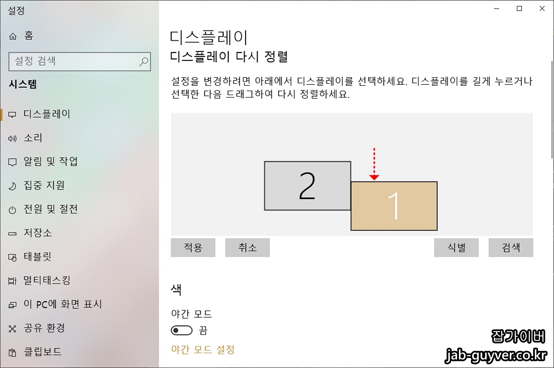식별을 눌러주면 다중모니터 중 어던게 1번이고 2번인지 확인할 수 있습니다.