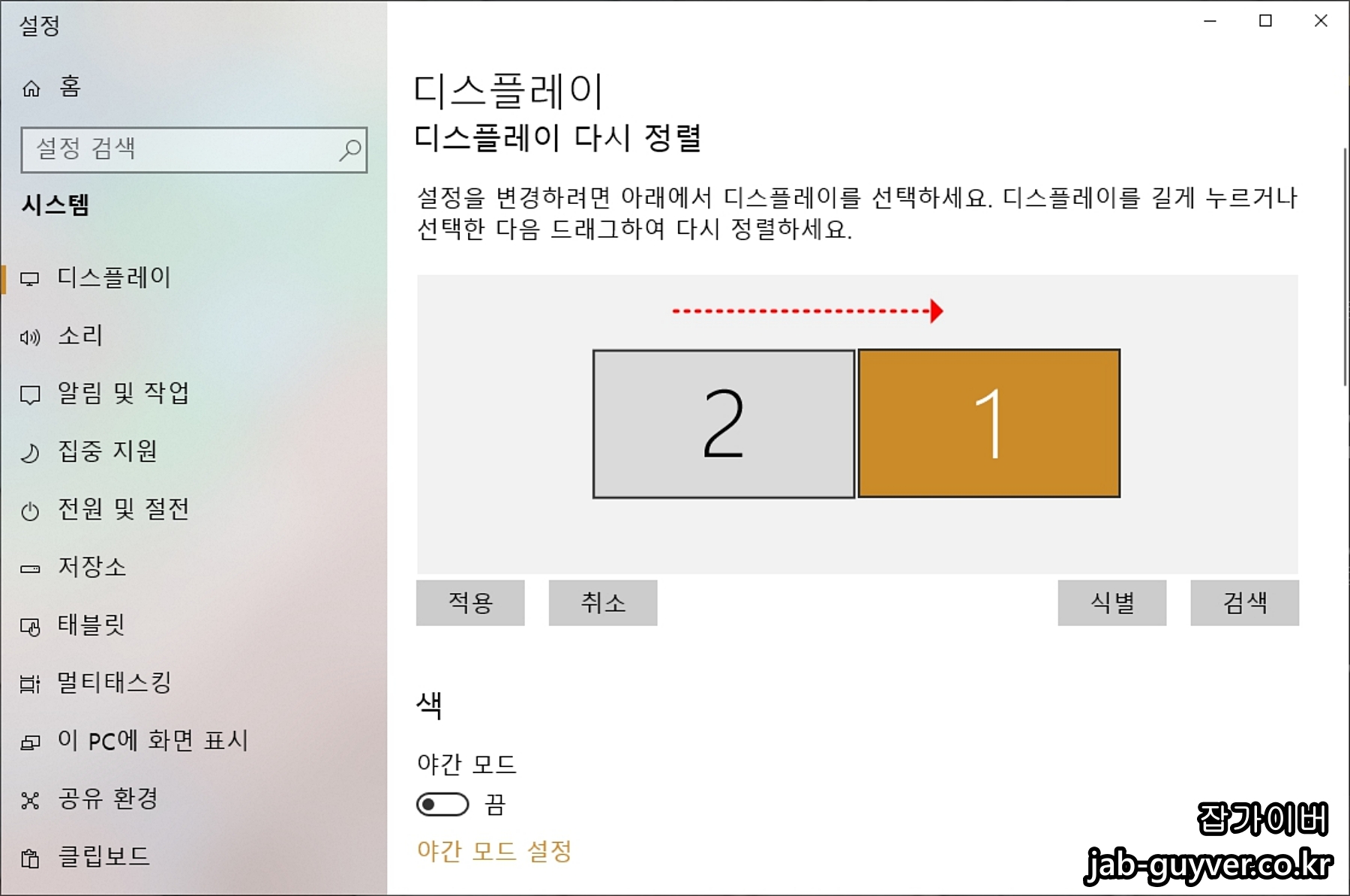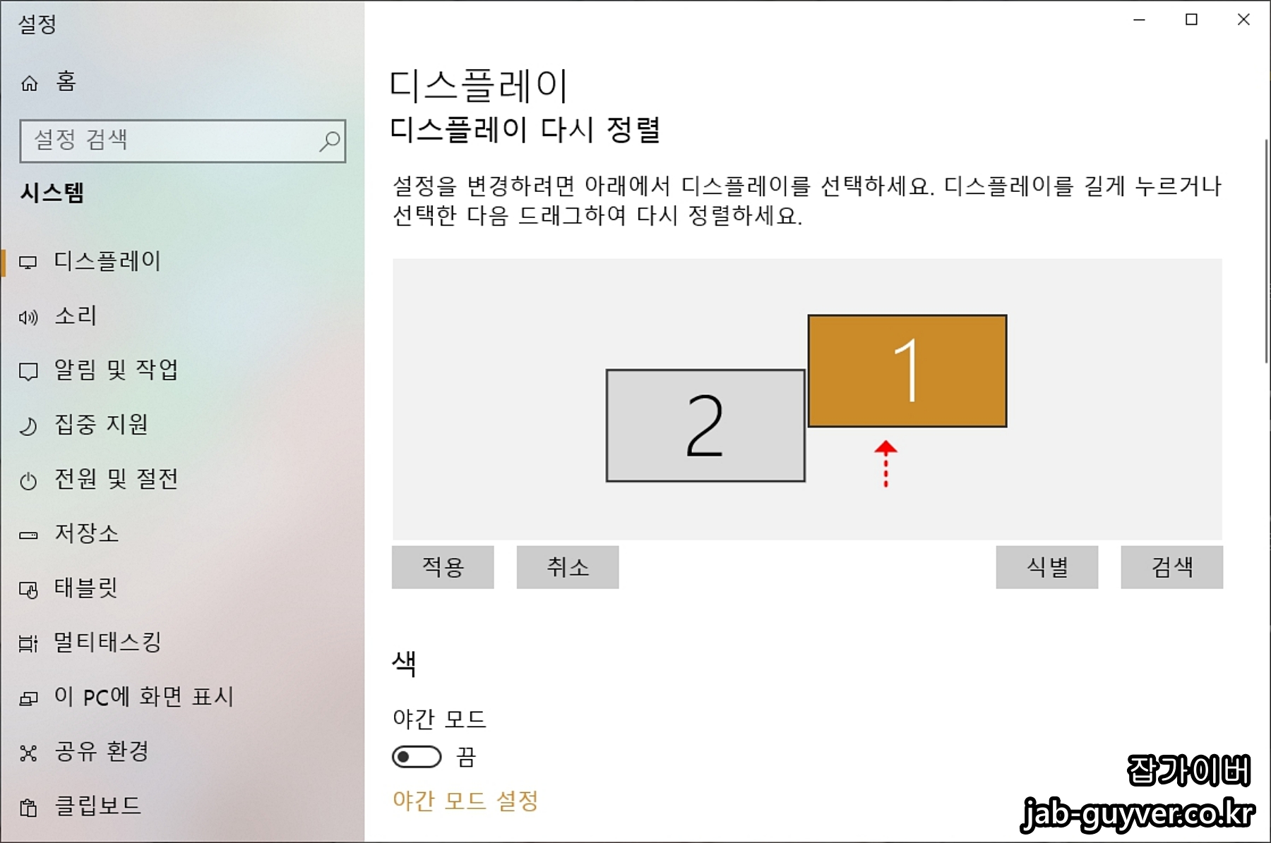 현재 연결된 모니터 중 어떤 모니터가 1이고 어떤게 2 모니터인지 확인하기 위해 식별 버튼을 눌러주고 모니터 제대로 인식되지 않는다면 검색을 눌러 모니터 다시 설정합니다.