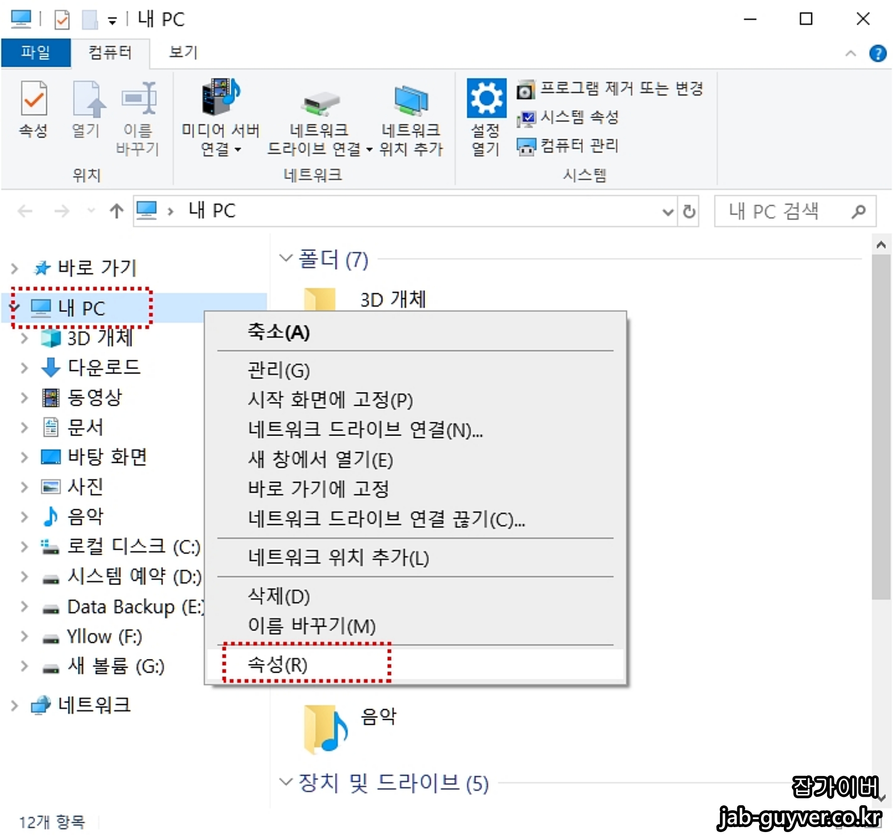 내PC 선택 후 마우스 우클릭 후 속성으로 들어갑니다.