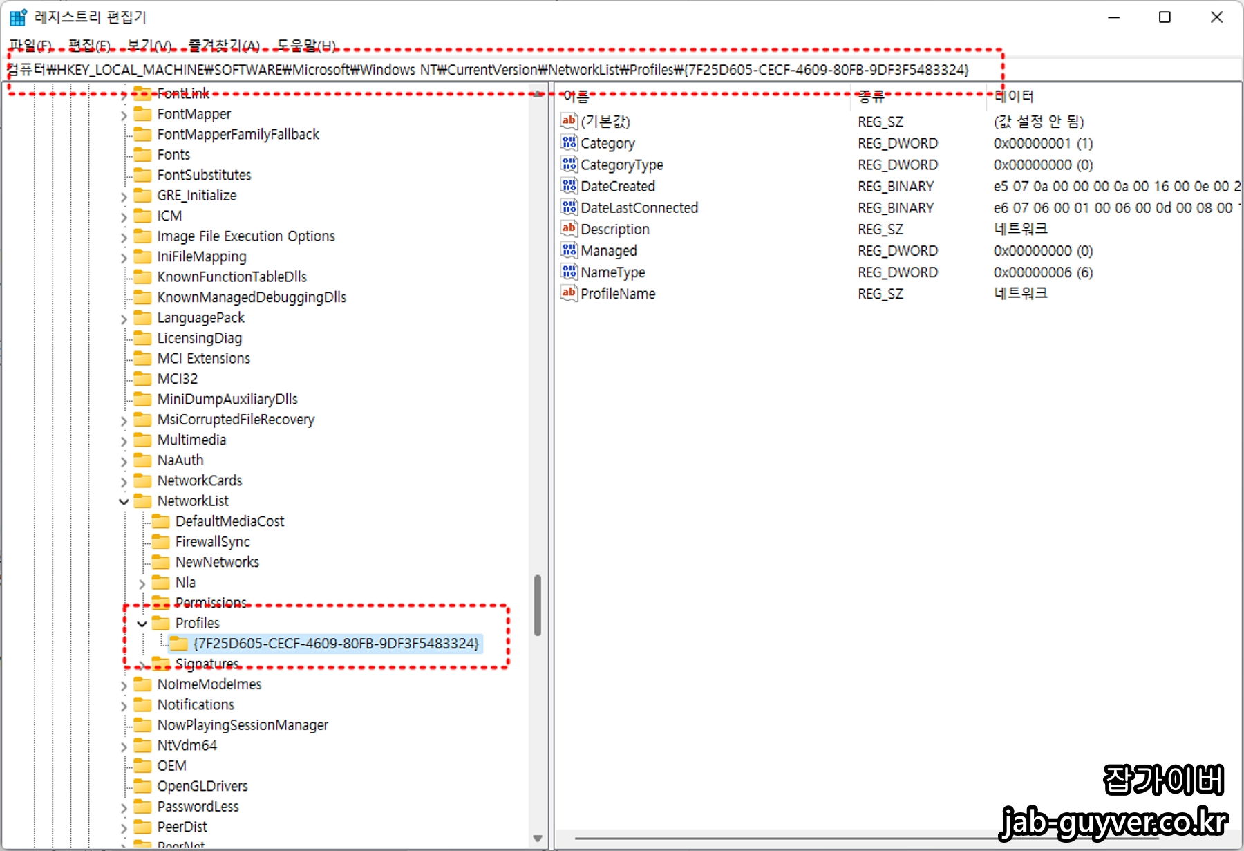 레지스트리 편집기에서 아래 경로로 이동 하면 프로필에서 프로필 이름을 통해 현재 네트워크 이름 "GUID (Global Unique Identifier) 번호를 확인할 수 있습니다.