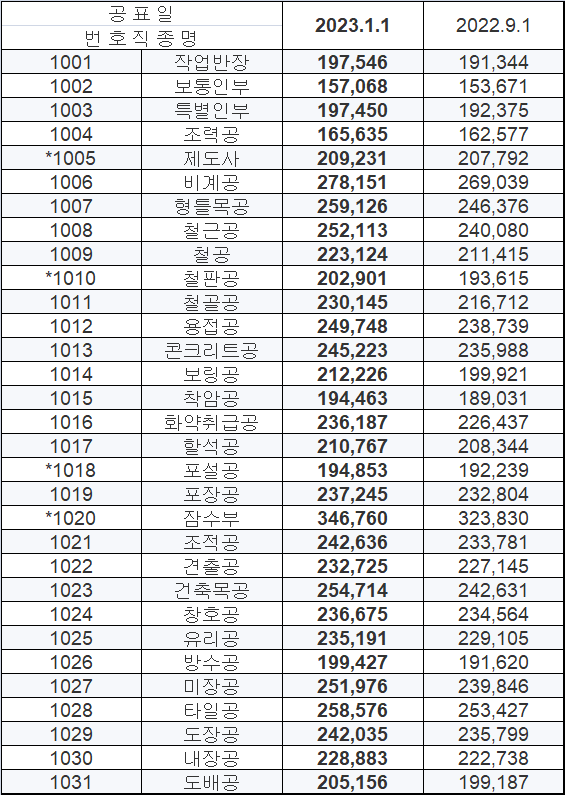 올해 2023년 상반기 기준으로 노임단가 공표가 대한건설 협회를 통해 등록되었으며 일반공사 직종 및 광전자 직종 문화재직종,원자력직종등등 정부가 정한 노임단가는 대한건설협회가 조사 발표한 2023년 상반기 적용 건설업임금실태조사보고서 (정부노임단가, 시중노임단가)로서 2023년 1월 1일 대한건설 협회를 통해 등록되었습니다.