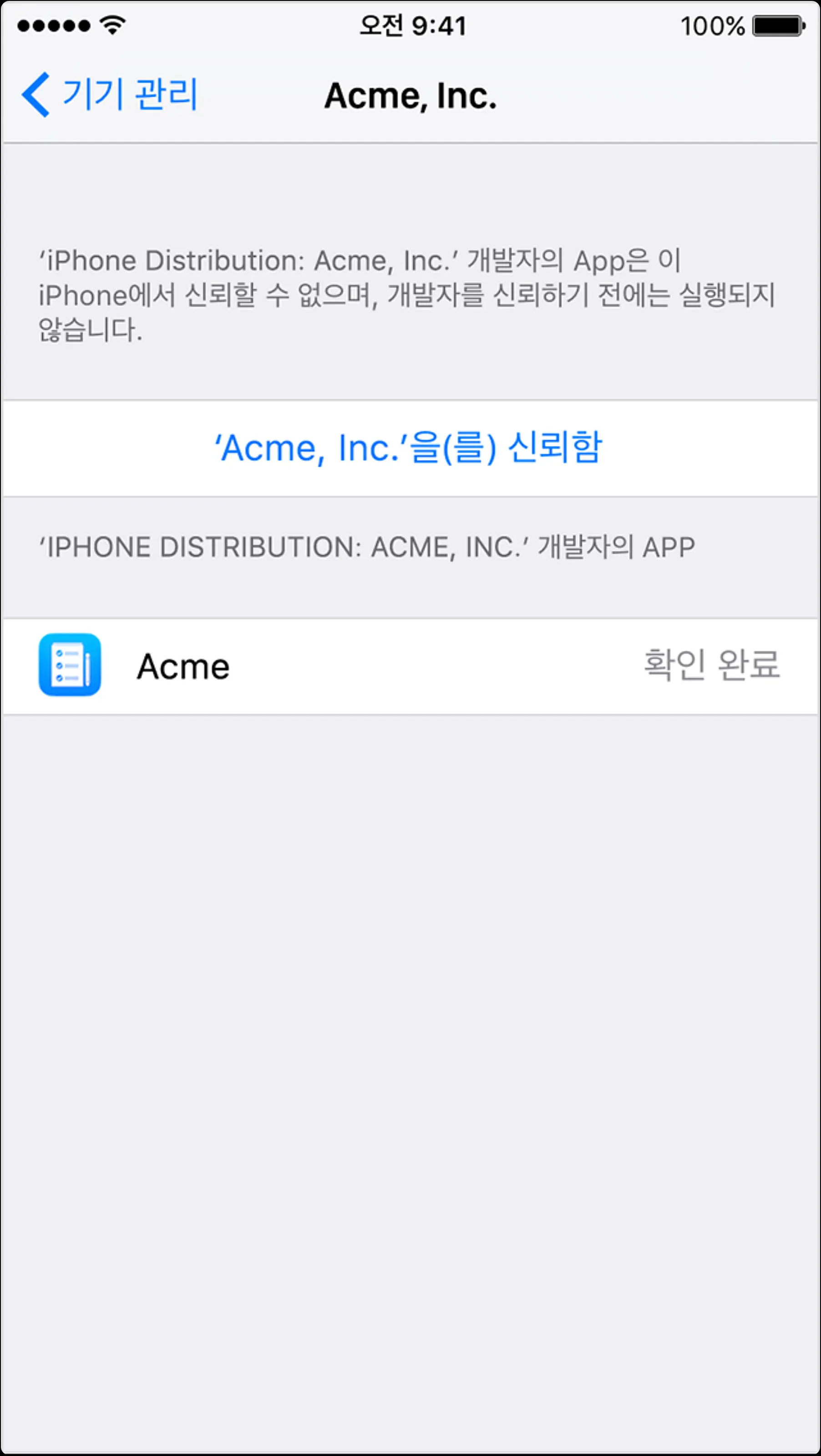 MDM(모바일 장비 관리)을 사용하여 앱을 설치하는 경우 신뢰가 자동으로 설정됩니다. 앱을 수동으로 설치하는 경우 신뢰 역시 수동으로 설정해야 합니다.