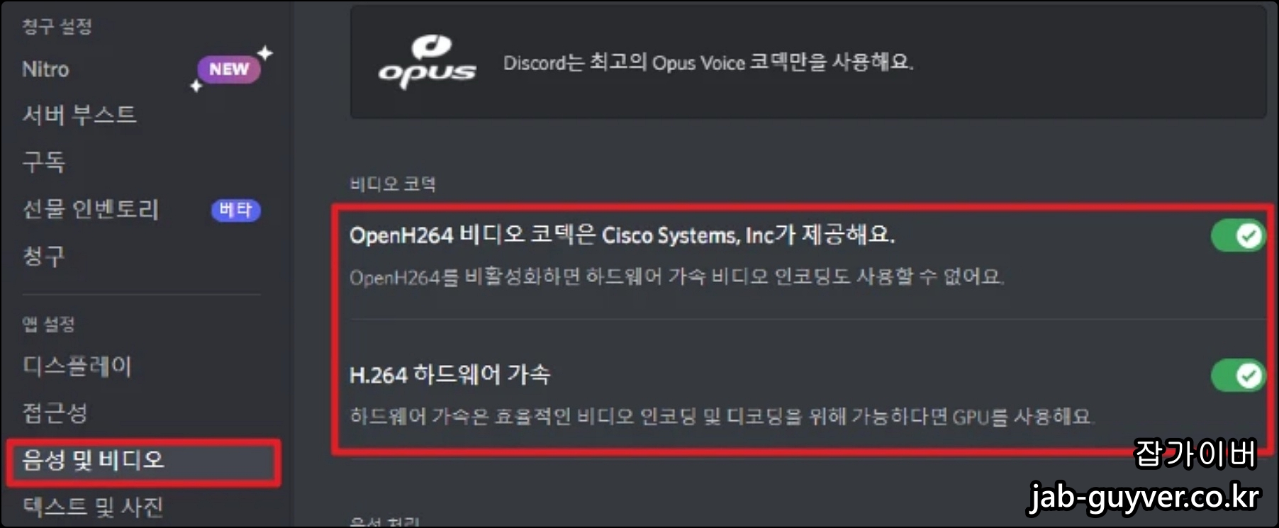 추가로 비디오코덱에서도 OpenH264 비디오 코덱을 Cisco Systems, ins 제공 및 H.264 하드웨어 가속을 꺼줍니다.