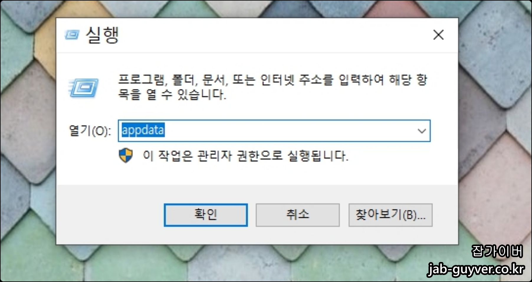 - 윈도우 실행(단축키 : Win + R)창을 실행창에 %appdata%\discord\Cache 를 입력하고 '확인'을 눌러줍니다.