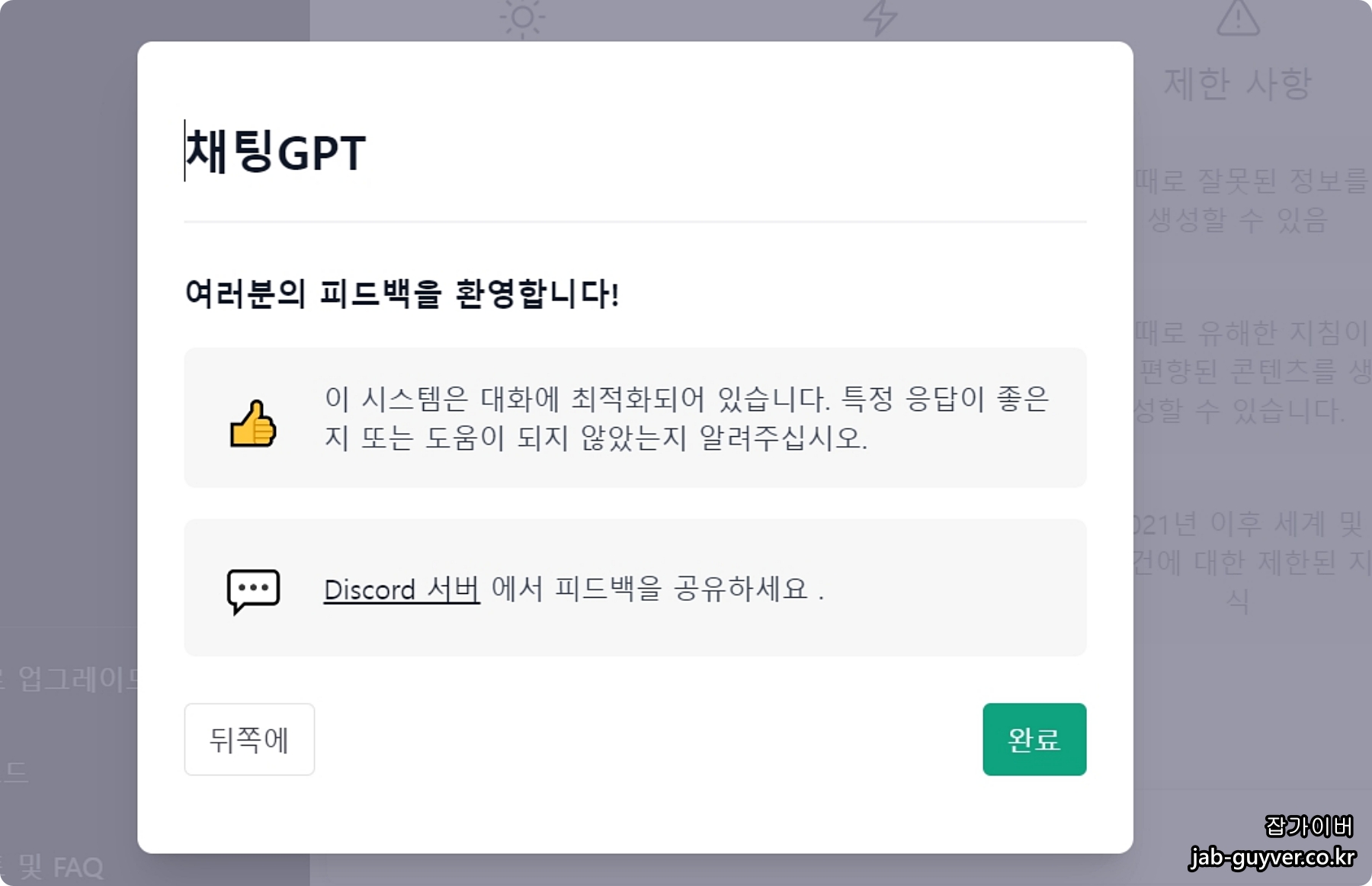 이상 ChatGPT 회원가입이 완료되었으며 기본적인 설명을 확인할 수 있습니다.