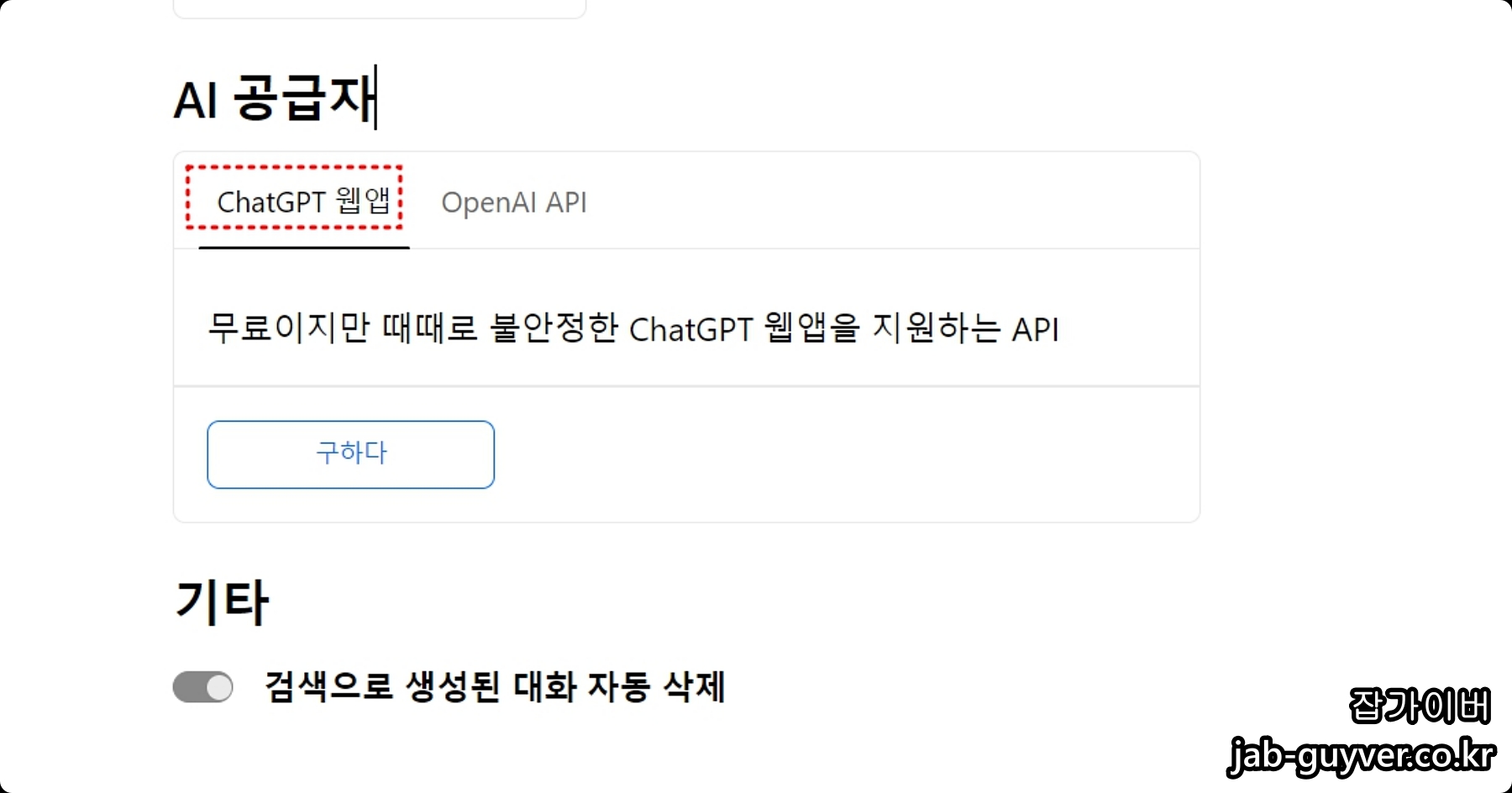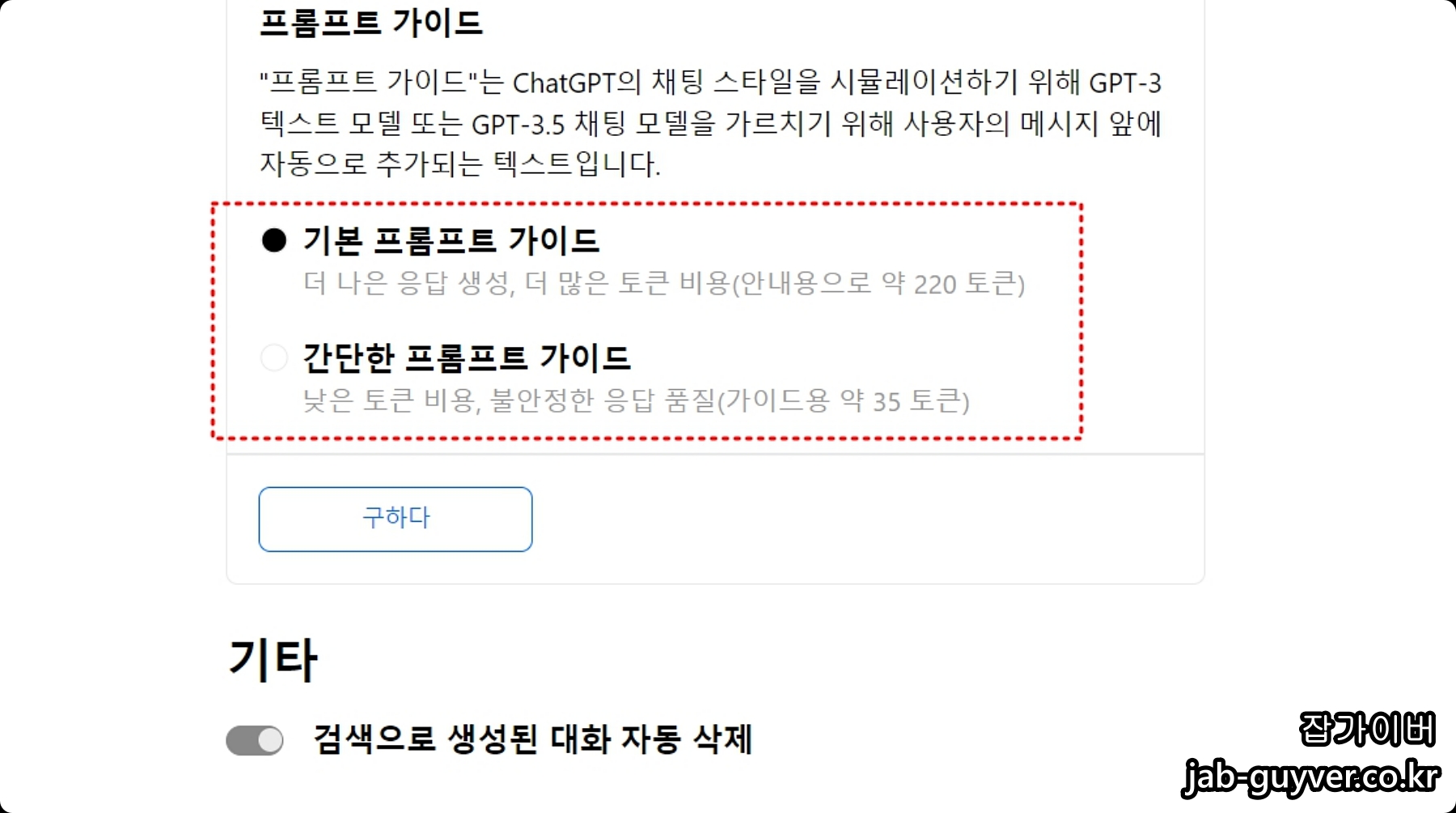 ChatGPT 설정에서 검색을 항상 실행할지 물음표를 통해 ChatGPT 활성화 및 수동설정을 할지 선택할 수 있습니다.