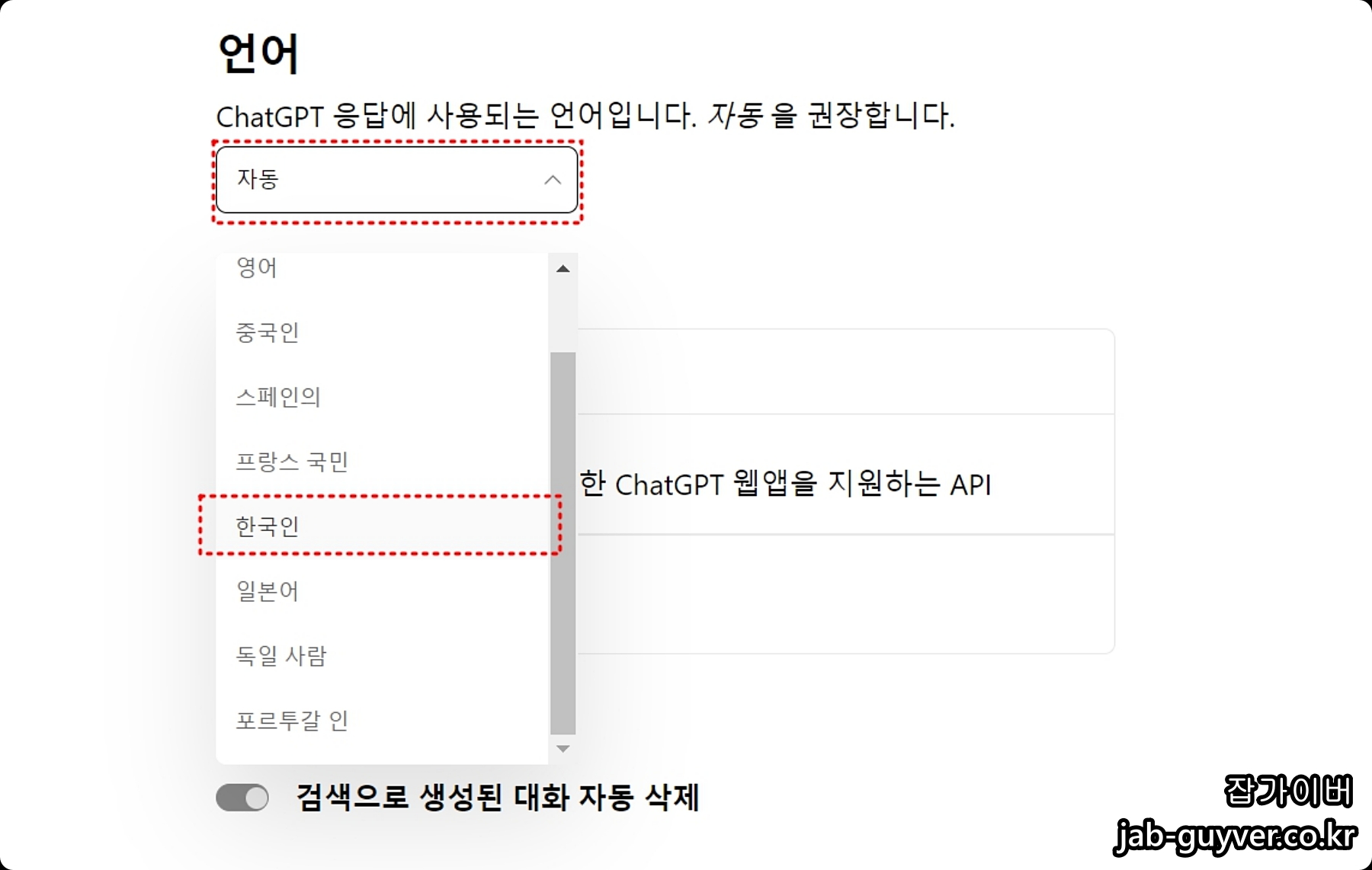 챗GPT 기본언어는 자동감지로 설정하면 검색 언어에 따라 자동으로 인식되며 한글로 검색을 고정하고 싶다면 한국인으로 설정해서 ChatGPT 한국어로 언어를 설정합니다.