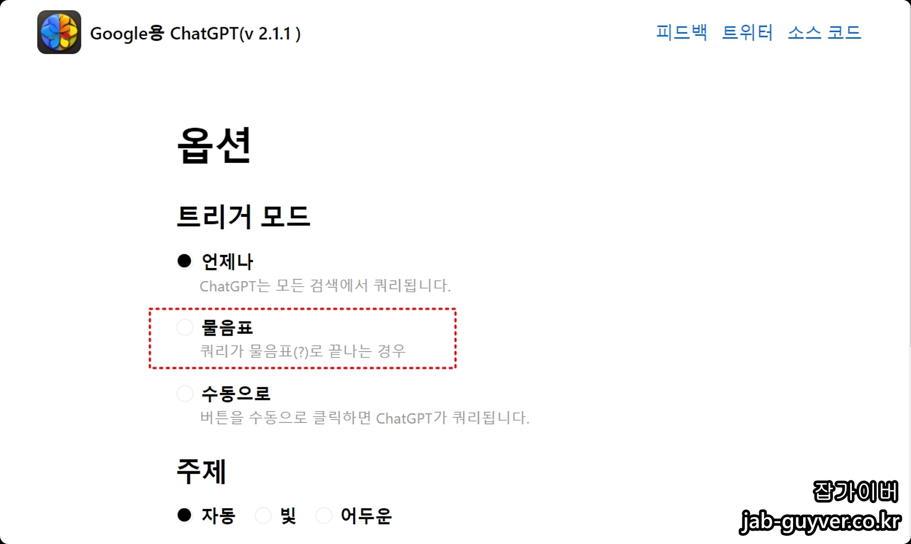다음 ChatGPT를 확장프로그램에 추가 한 뒤 크롬에 추가된 챗지피티는 설정옵션에서 어떻게 검색할지 3가지를 지원합니다.