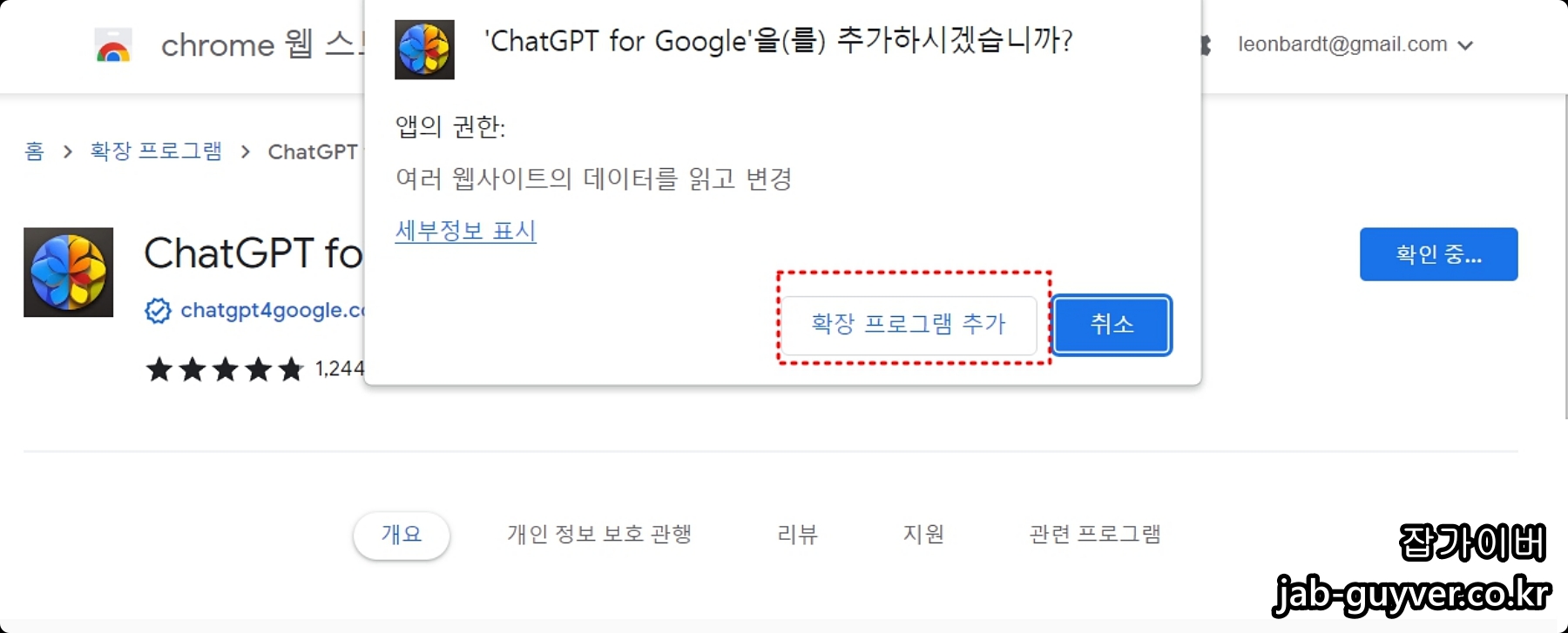 상단에 뜨는 ChatGPT For Google 입력 후 크롬에서 ChatGPT 추가해줍니다.
