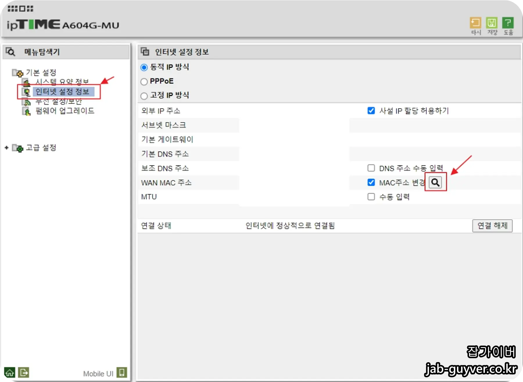 ipTime (아이피타임) 공유기를 사용한다면 192.168.0.1 접속해 로그인 후 인터넷 설정 정보에서 Mac주소 변경을 통해 수동으로 맥주소 변경할 수 있습니다.