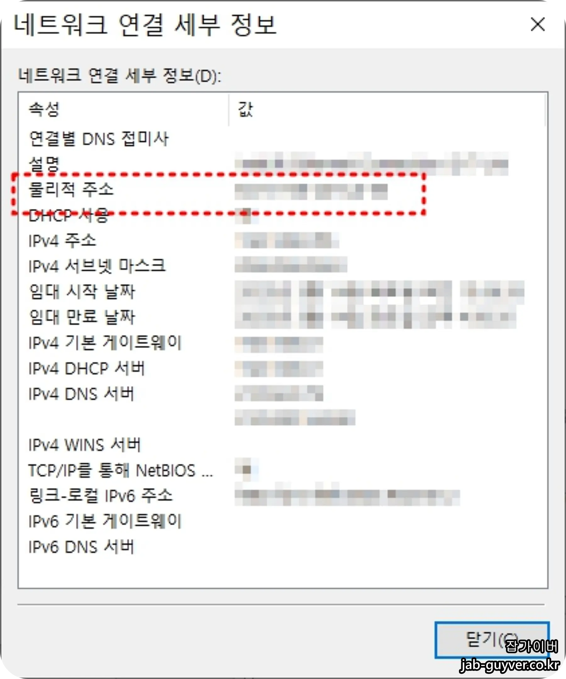 그리고 자세히를 통해 현재 물리적주소 및 IPv4, IPv6, 임대시작날짜, 임대만료날짜, 기본게이트웨이, DHCP 서버주소, DNS 서버주소등을 확인할 수있습니다.