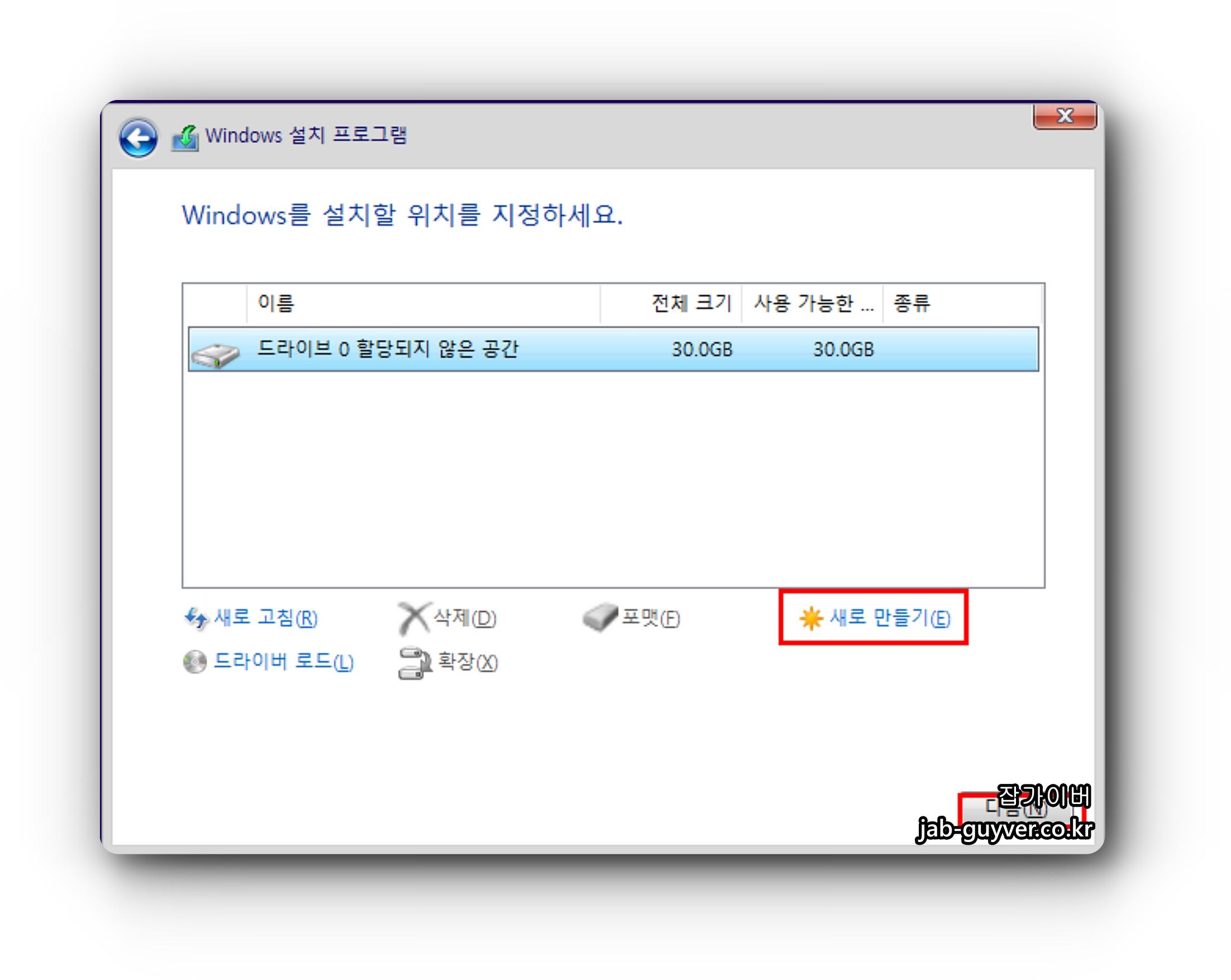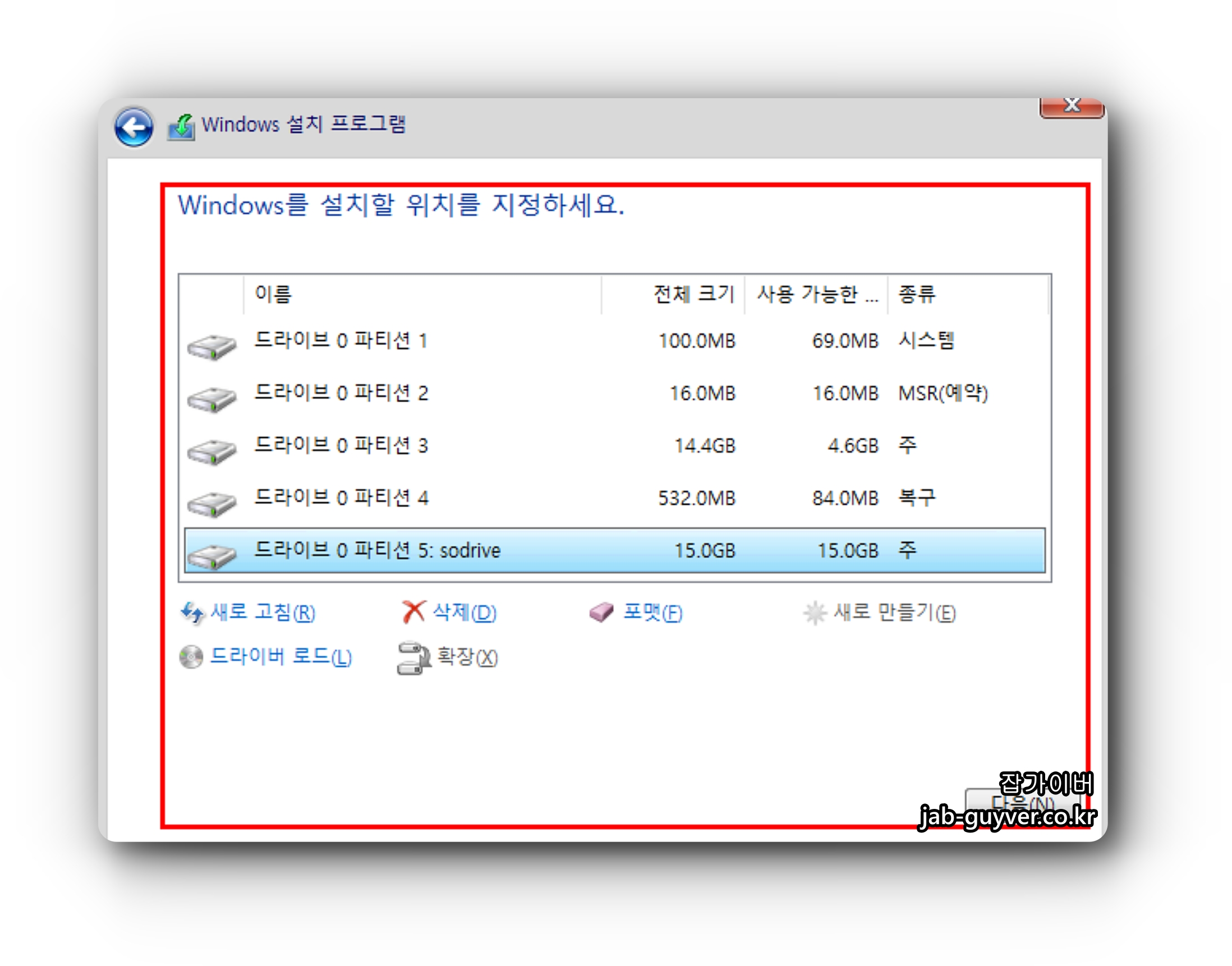 기존의 윈도우 삭제하고 싶다면 윈도우가 설치된 파티션을 선택 후 포맷을 눌러 삭제합니다.