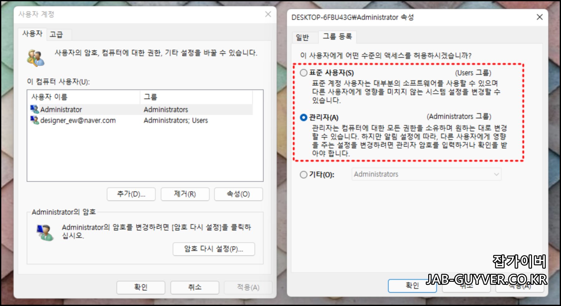여기서 원하는 윈도우계정을 추가할 수 있으며 이때 일반 사용자계정 및 관리자계정 (Administrator) 추가할 수 있습니다.