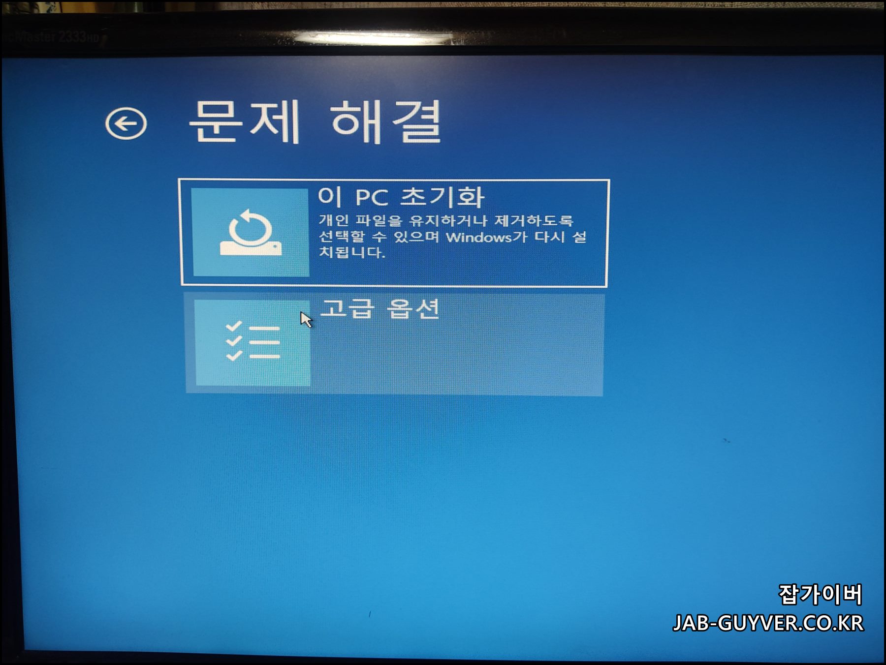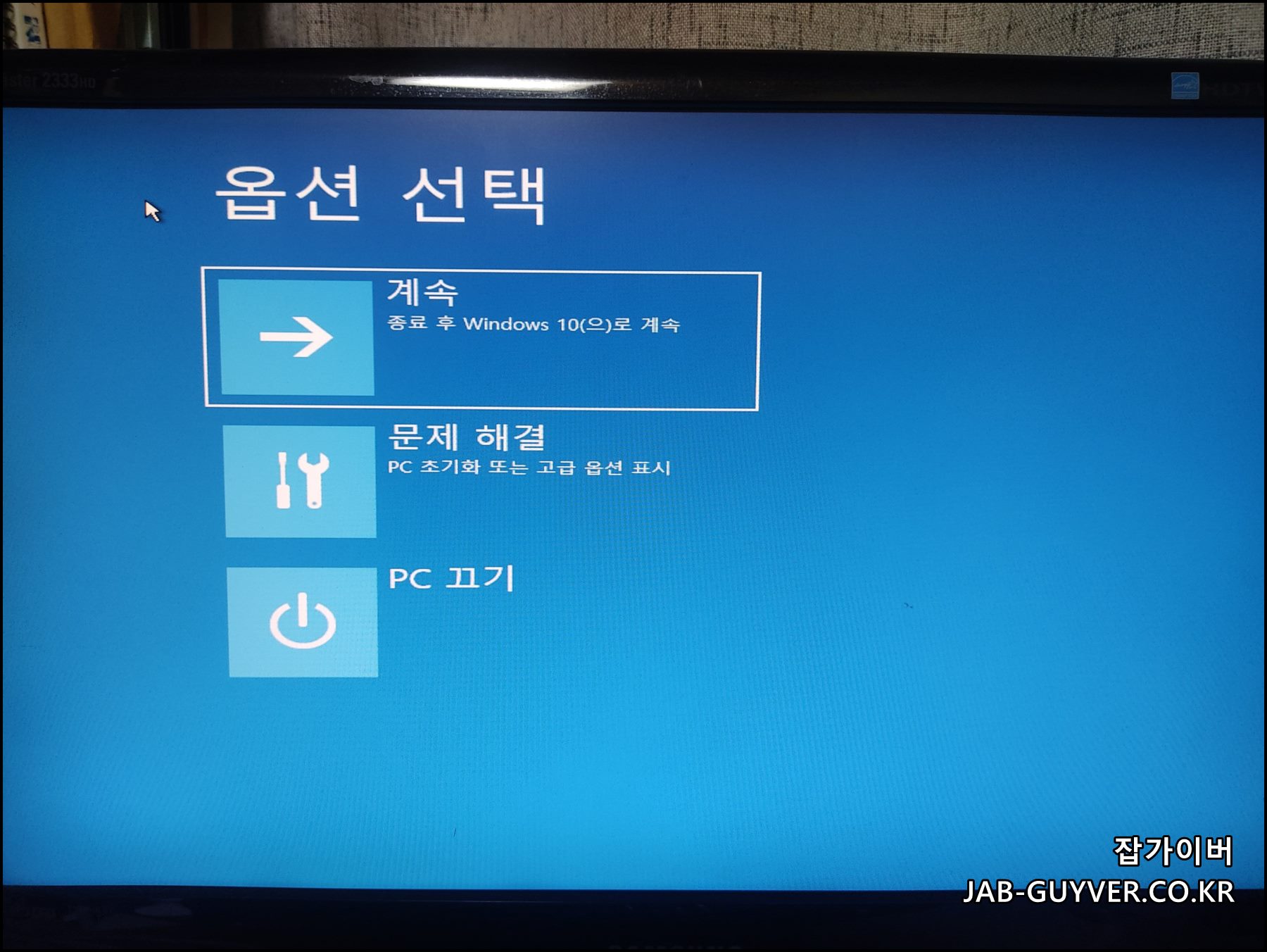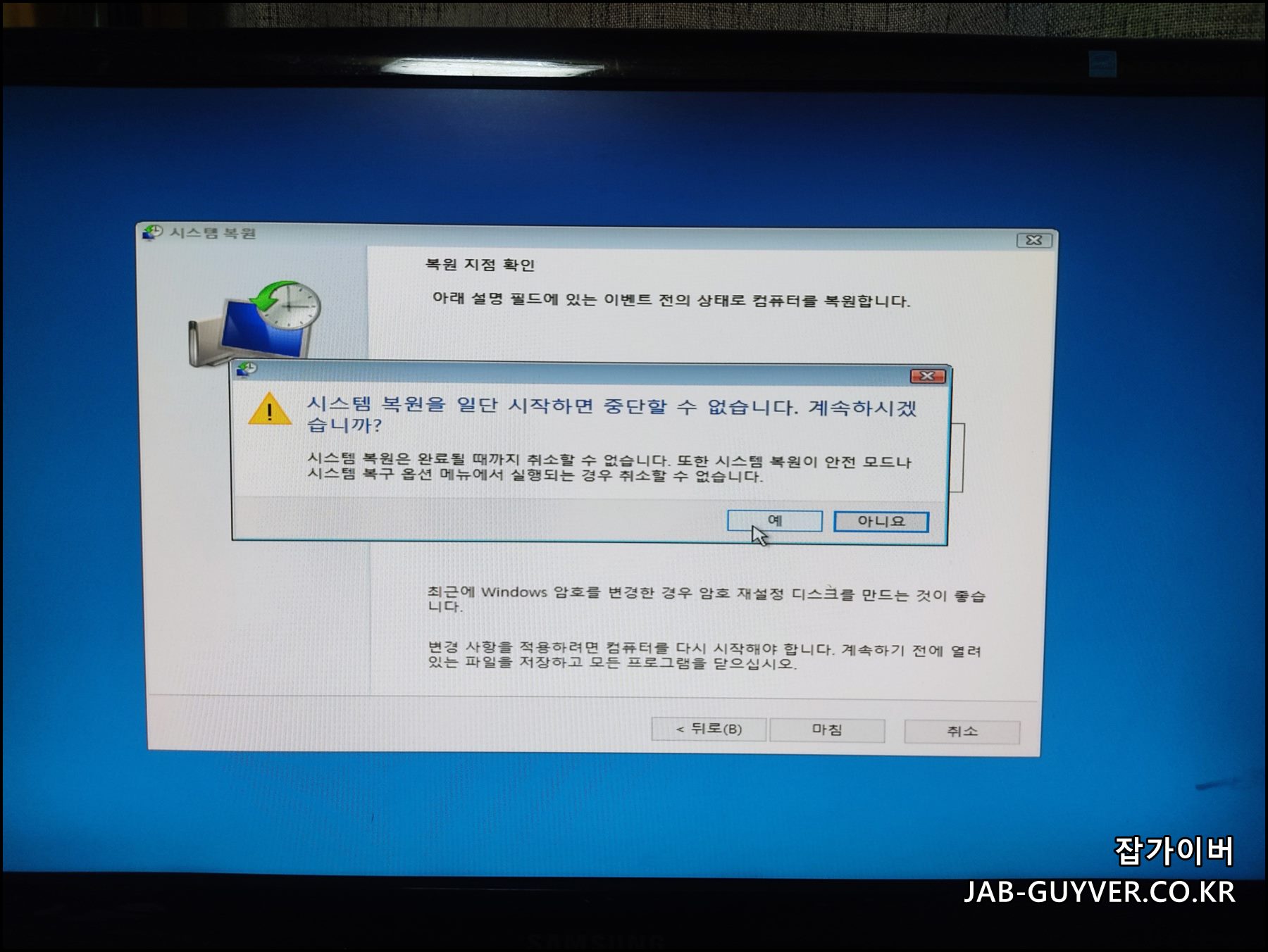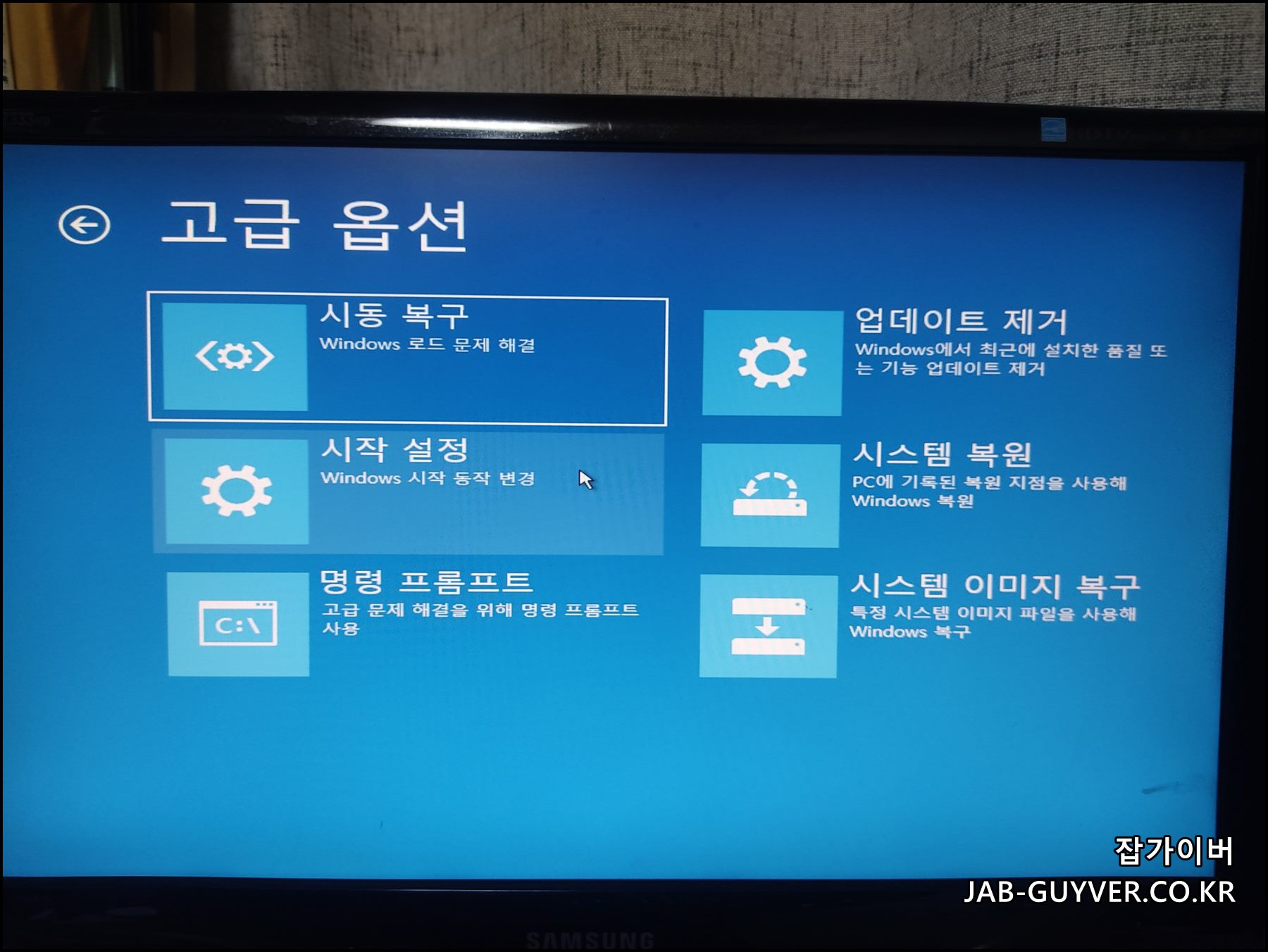 두 번째는 복구모드에서 시스템 복원으로 문제가 생기기 전 상태로 되돌리는 방식입니다.
