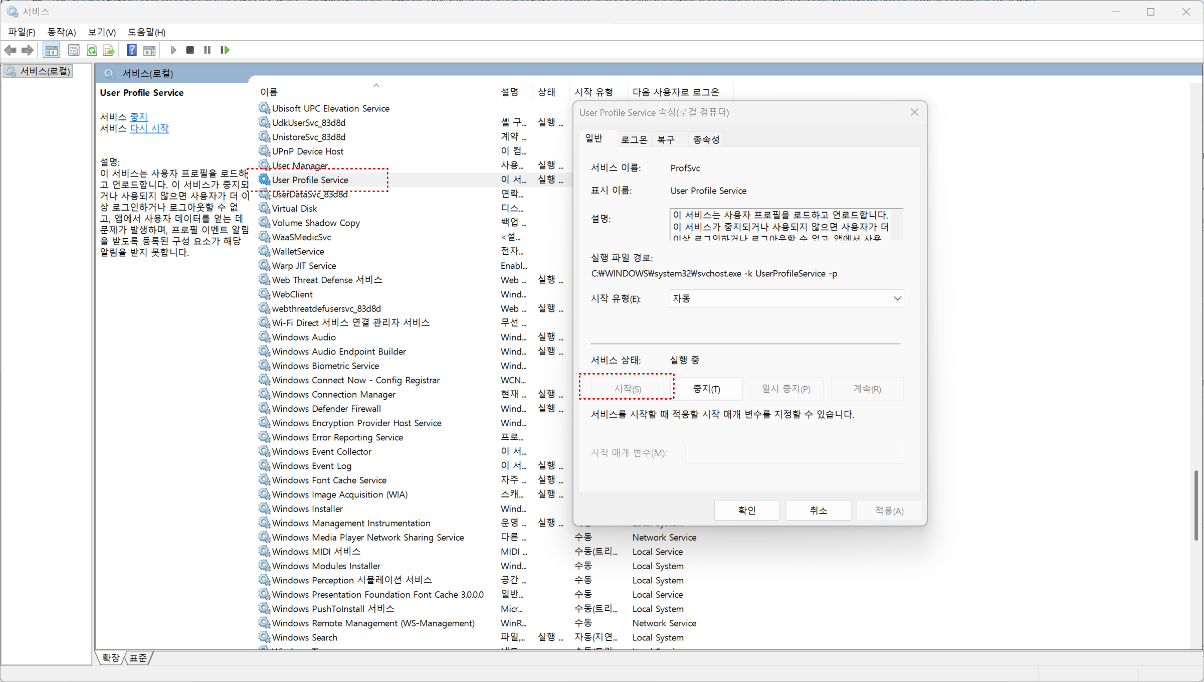 윈도우 검색창에서 서비스(services.msc)를 열고 User Profile Service가 중지되어 있거나 비정상 상태로 보이면 자동/시작 상태를 점검한 뒤 재부팅합니다.