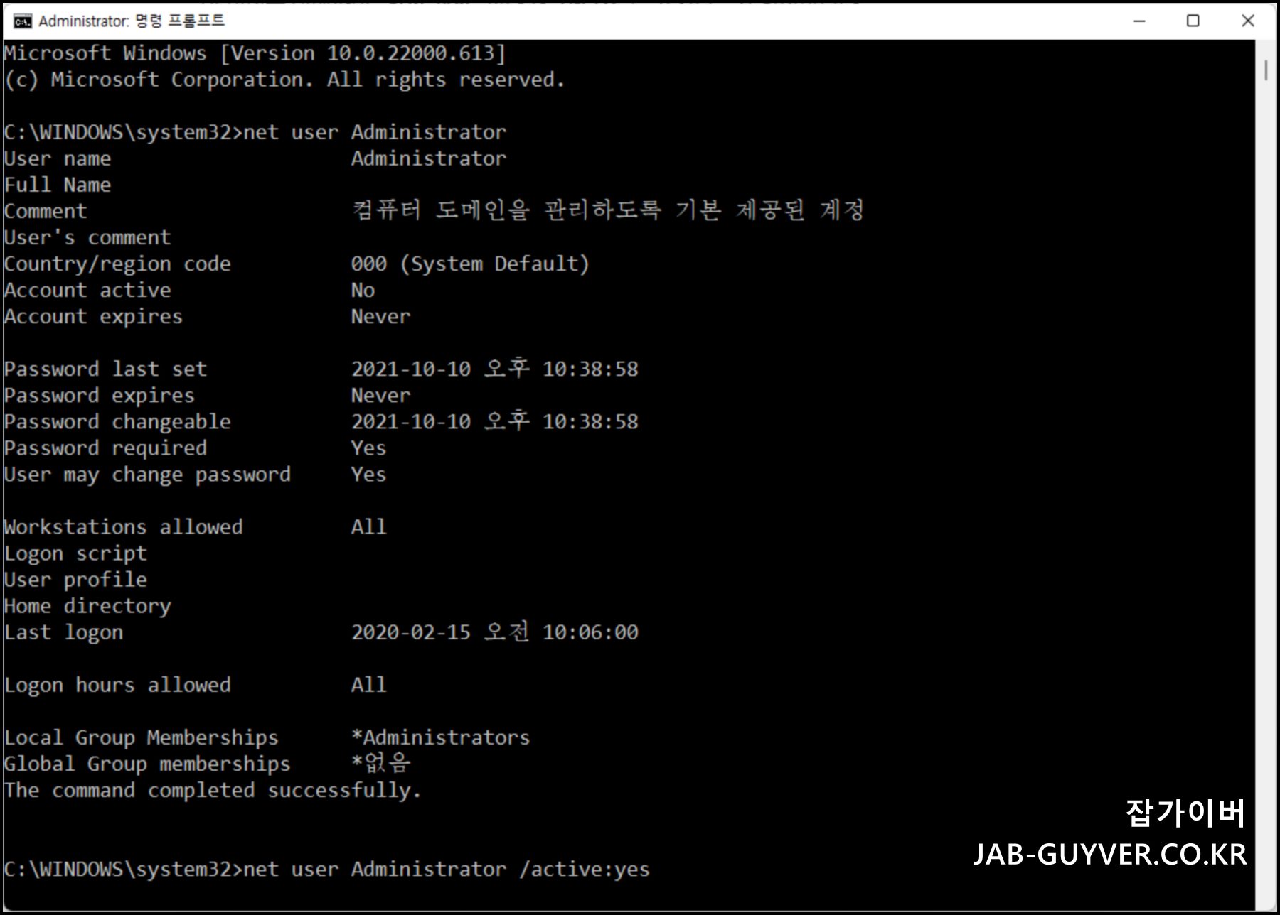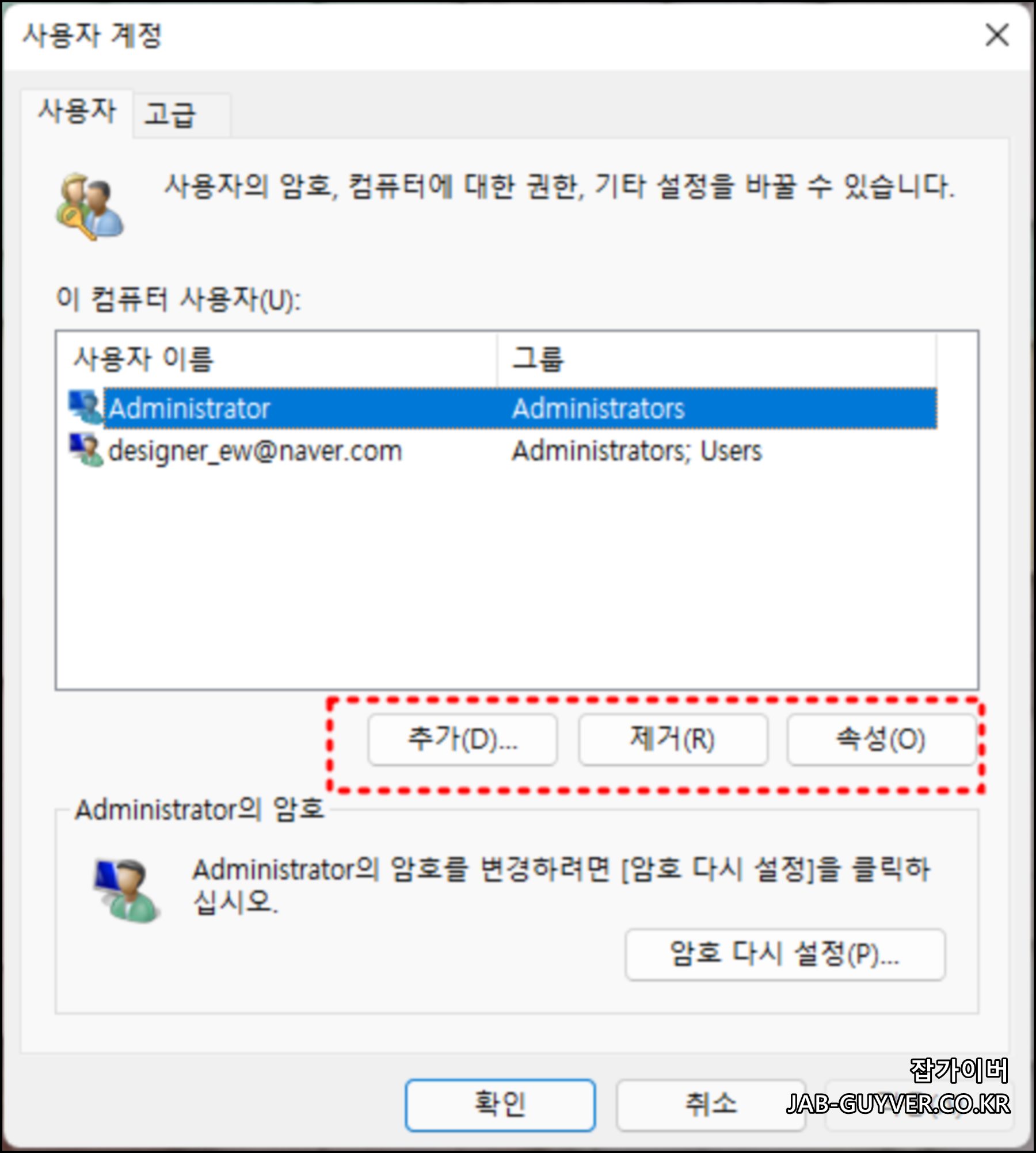 정상 로그인이 확보되면 Administrator는 계속 메인으로 쓰기보다는, 새로 만든 로컬 계정에 관리자 권한을 부여해 쓰고 Administrator는 비활성화해두는 편이 보안상 깔끔합니다. 계정 비밀번호도 반드시 설정해두는 게 좋습니다.