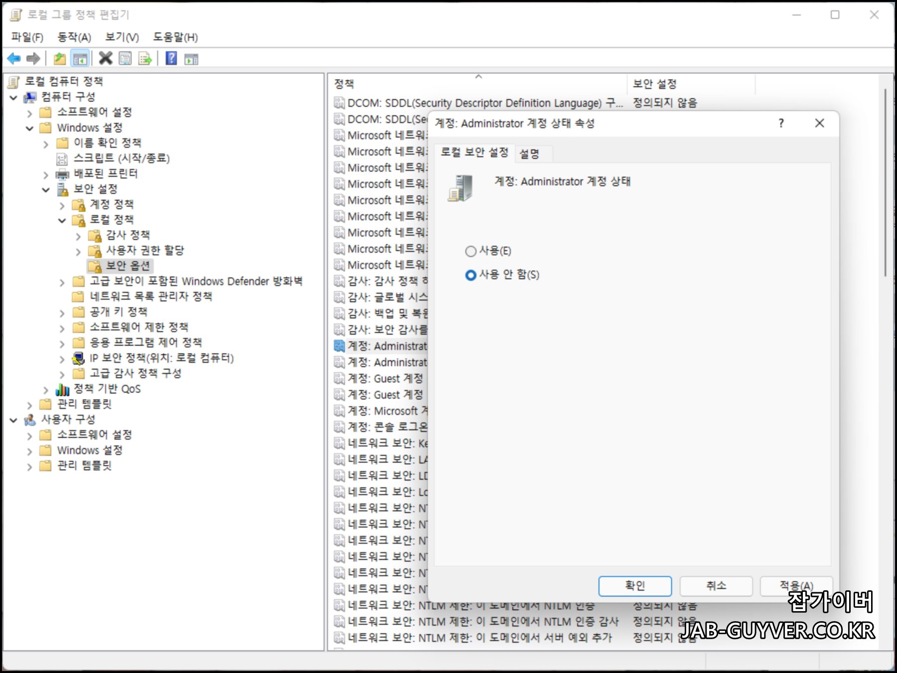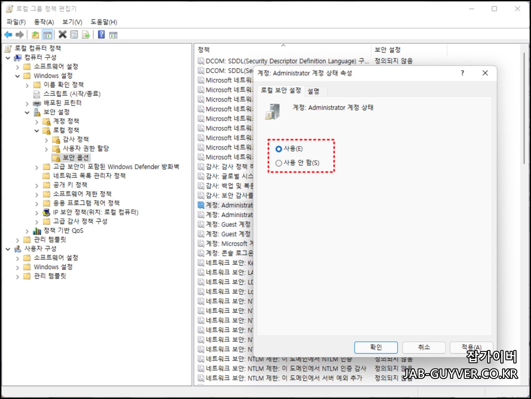 로컬그룹편집기 실행 후 보안설정 -> 보안옵션 -> 계정 Administrator 계정상태를 선택합니다.