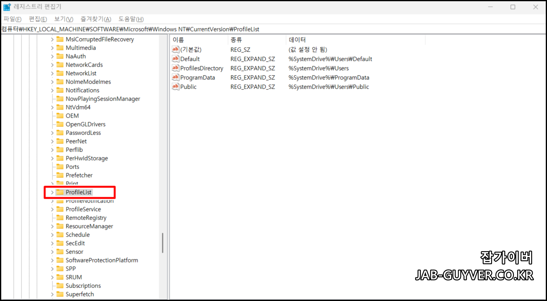 각 키를 클릭했을 때 오른쪽의 ProfileImagePath 값이 C:\Users\사용자폴더명 형태로 나오는데, 이걸로 실제 어떤 계정인지 구분할 수 있습니다.