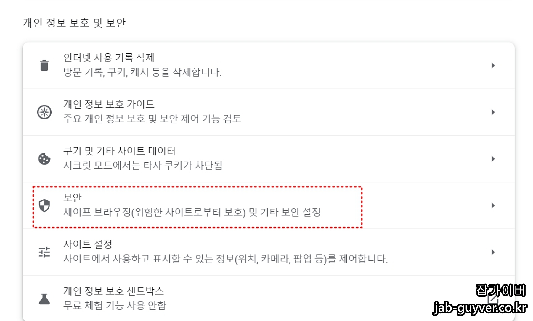 | 세이프 브라우징 | 설정 → 개인정보 및 보안 → 보안 → 세이프 브라우징 | 피싱 사이트, 악성코드 사이트 자동 차단 | 향상된 보호 |