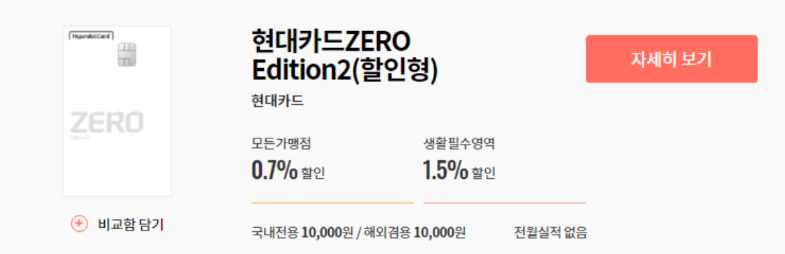 | 5 | 현대카드 ZERO Edition3 (할인형) | 무실적 시 0.8% 청구 할인 | 전 국내외 가맹점 대상 | 1만5천원 |