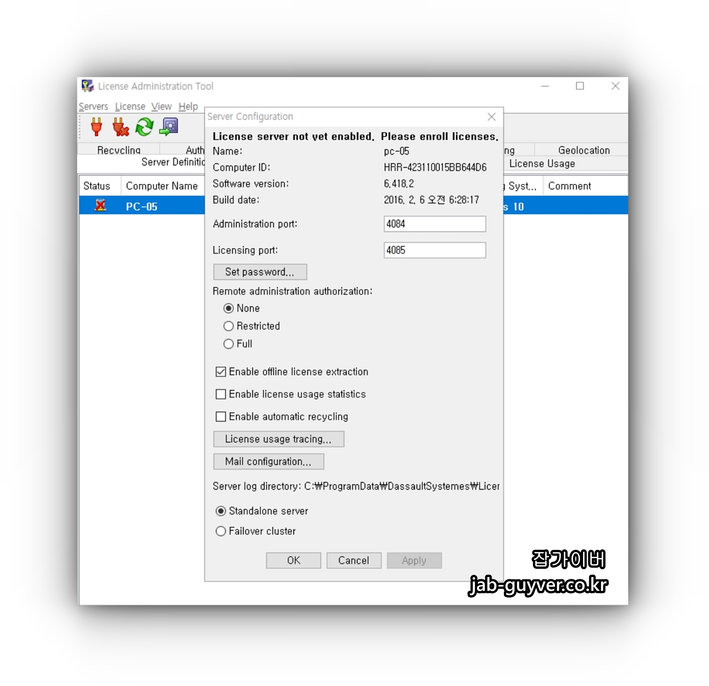 라이센스의 경우 라이센스 서버의 이름은 Locahost로 설정하면 되고 클라이언트 pc에서 서버pc로 라이센스를 끌어온다면 해당 pc의 hostname을 입력합니다.