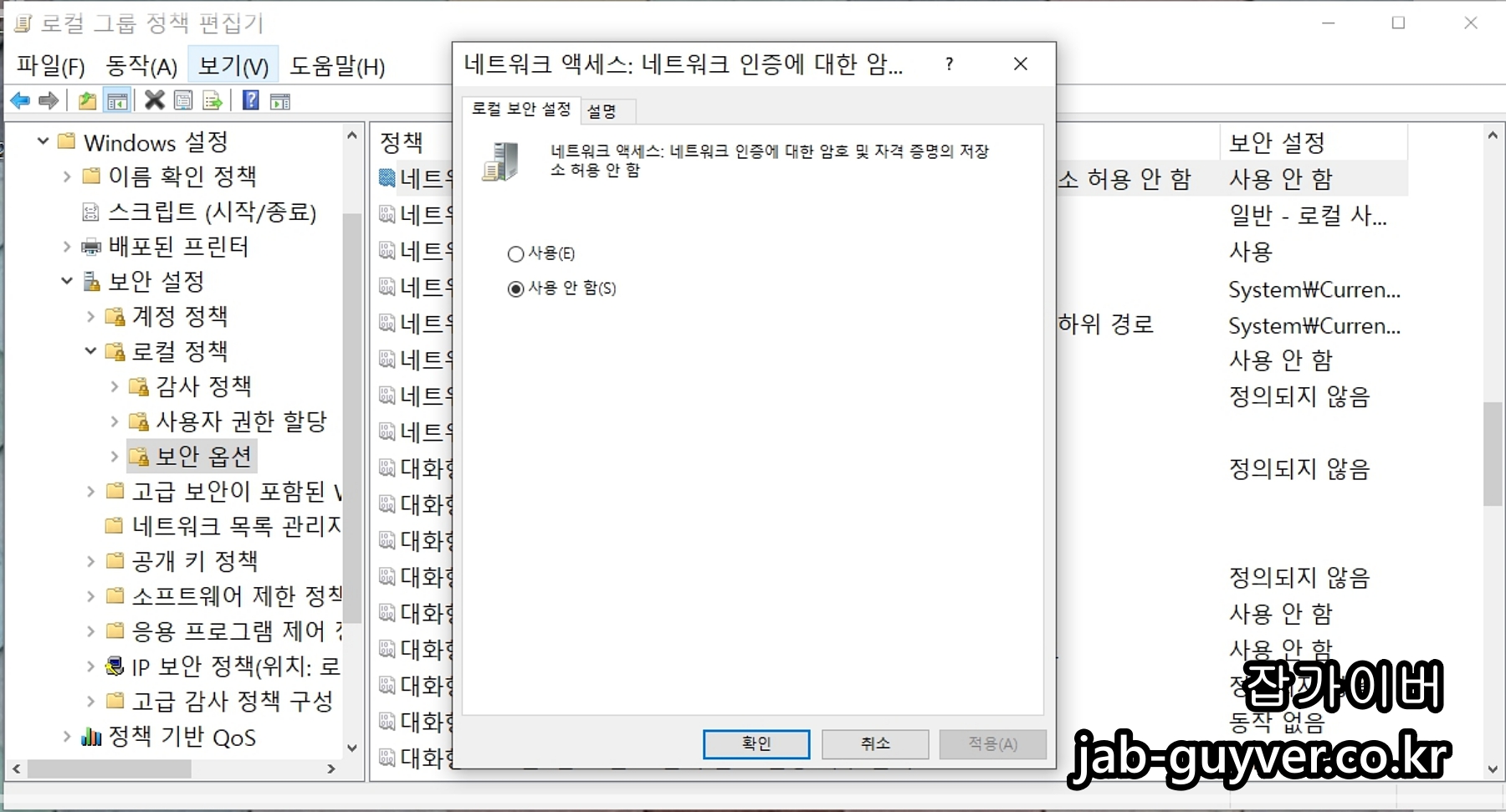 컴퓨터 구성 -> Windows 설정, 보안설정 -> 로컬정책 보안옵션에서 확장정책 -> 네트워크 액세스 : 네트워크 인증에 대한 자격증명 저장소를 Net Passports 속성을 사용안함으로 체크합니다.