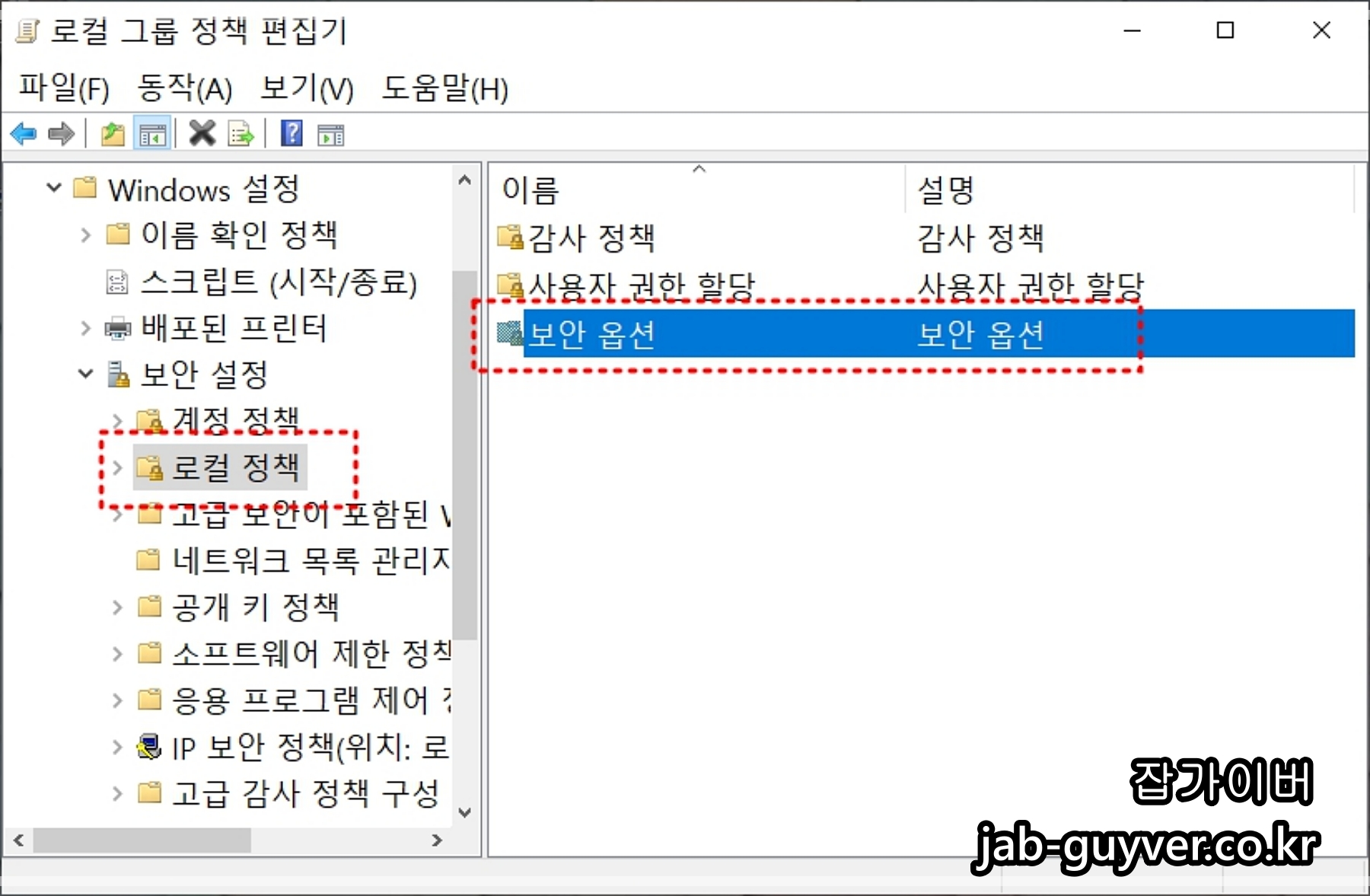 다른방법으로는 secpol.msc 입력 후 확인을 눌러도 됩니다.