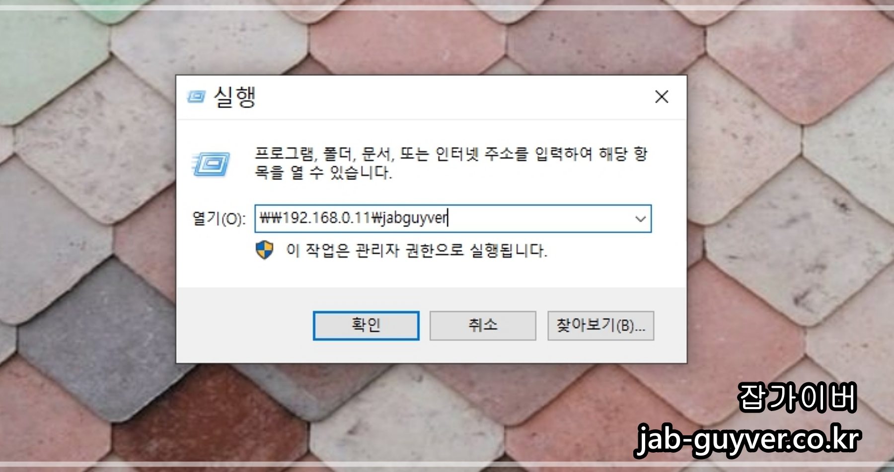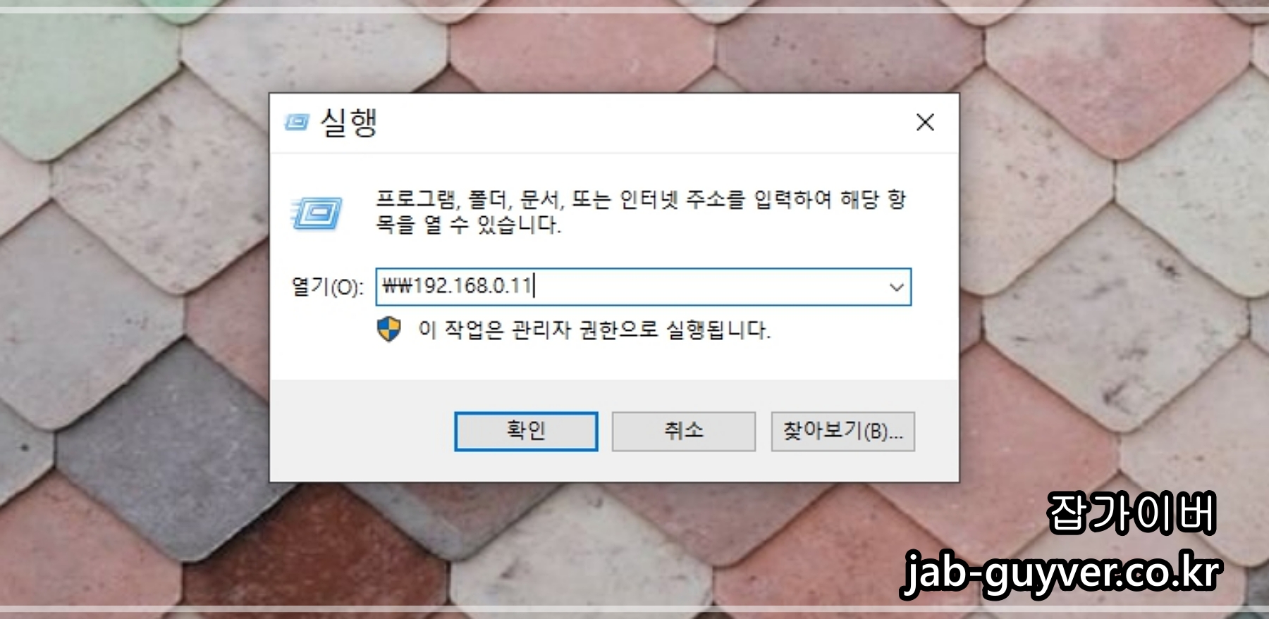 윈도우 키 + R을 눌러 실행창에서 접속하고자 하는 네트워크 드라이브 IP주소를 입력합니다.