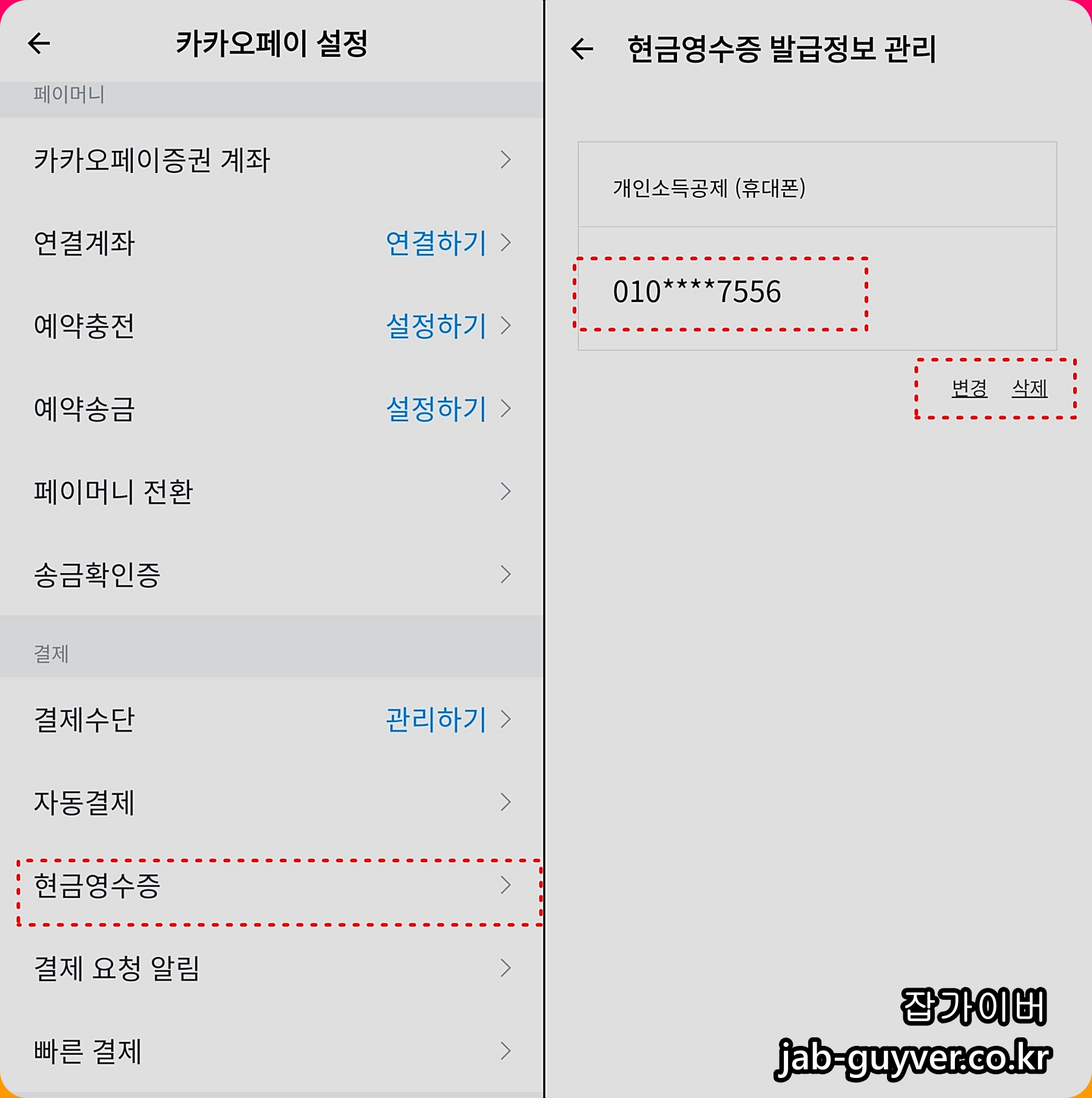 현금영수증 발급정보 관리를 통해 현재 등록된 현금영수증 번호를 확인하고 가족명의나 타인명의 핸드폰번호를 등록하면 이후 카카오페이 결제 시 자동으로 가족명의 현금영수증이 등록됩니다.