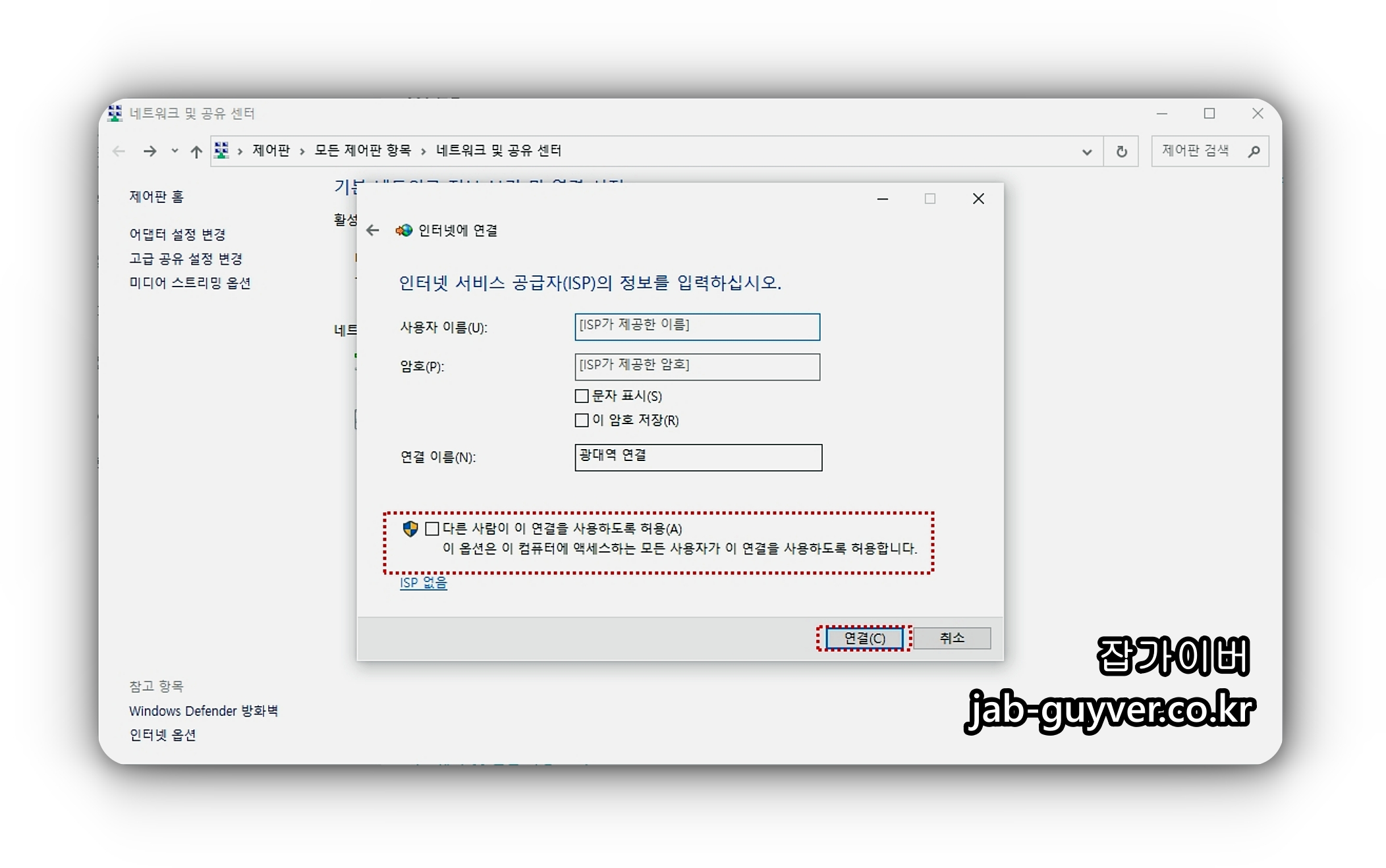 이때  다른 사람이 이 연결을 사용하도록 허용해주며 사용자  이름 및 암호등 인터넷 서비스 공급자 ISP 정보를 입력합니다.