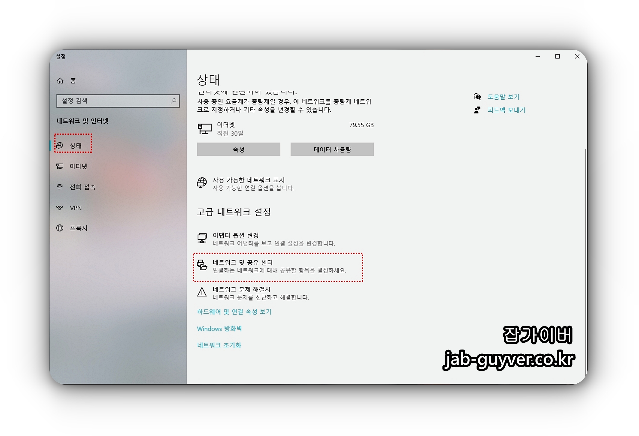 상태  -> 네트워크 및 공유센터로 들어갑니다.