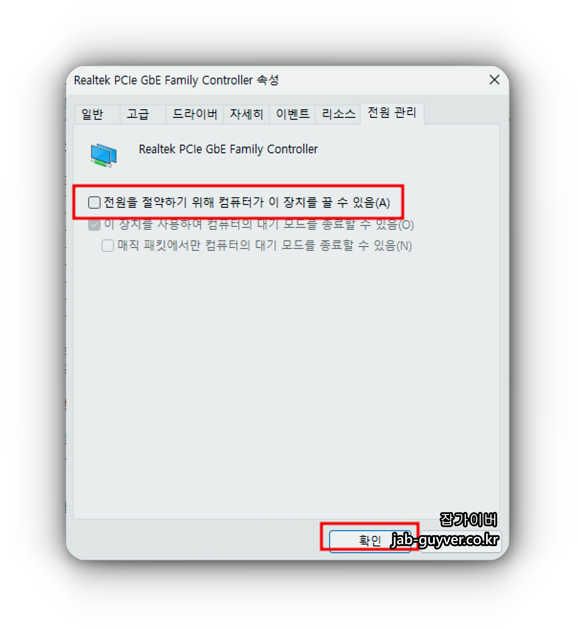 속성 ->  전원관리 -> 전원을 절약하기 위해 컴퓨터가 이 장치를 끌 수  있음을 체크되어 있다면 체크를 해제해줍니다.