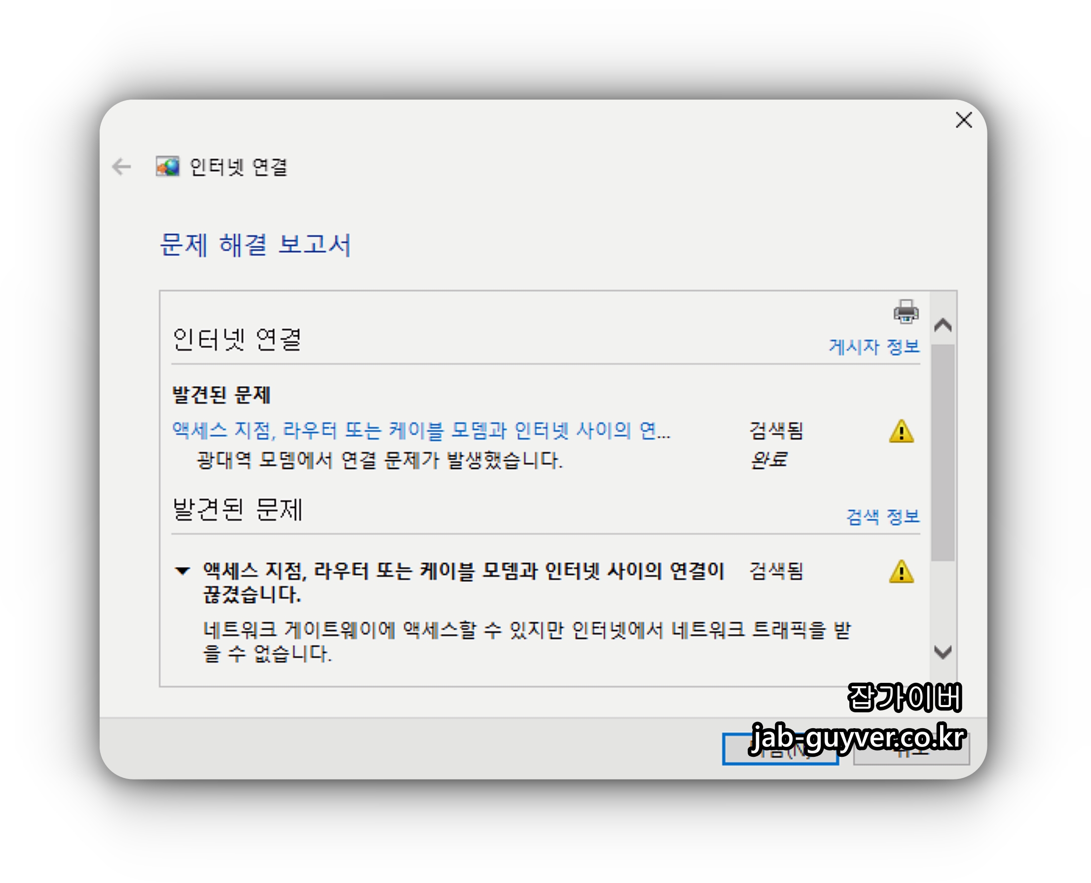 광대역 모뎀에서 연결 문제가 발생했습니다.가 계속 발생한다면 이 연결진단을 통해 문제의 원인을 찾아봅니다.