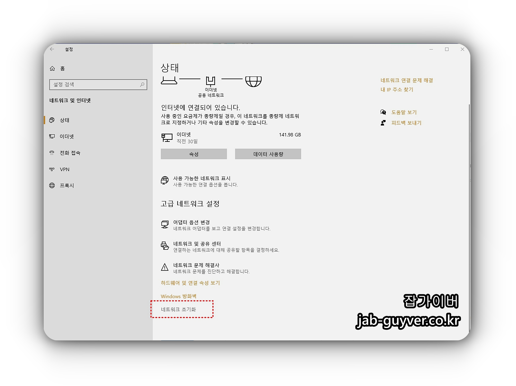 인터넷 연결이 잘 되다가 갑자기 네트워크 연결이 안된다면 윈도우에서 제공하는 네트워크 초기화를 진행해봅니다.