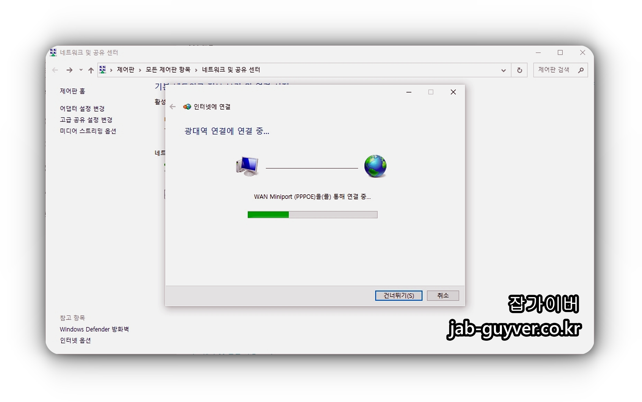 광대역 연결이 완료되면 이후 인터넷 연결이 되느것을 볼 수 있습니다.