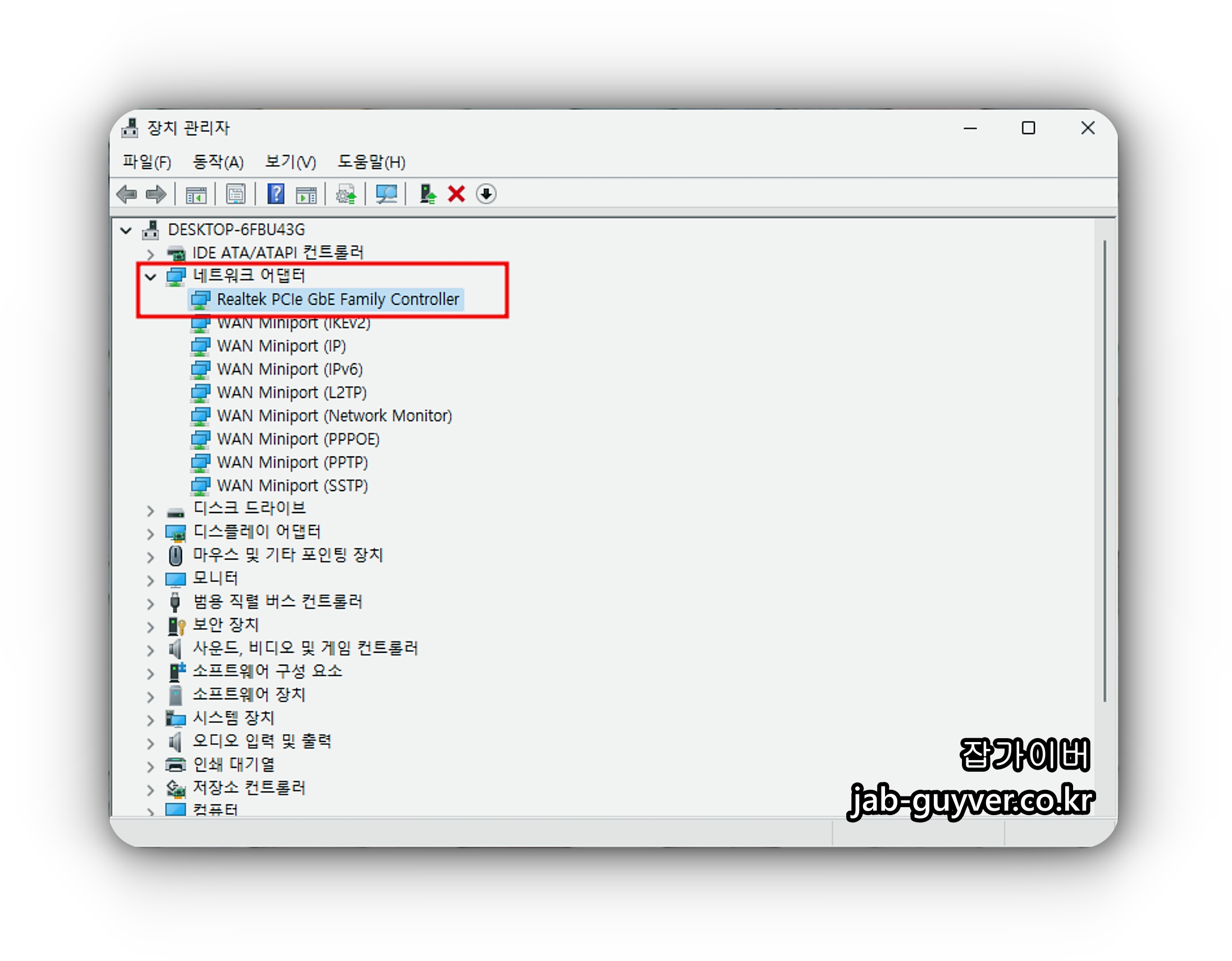 그럼 윈도우에서 자동으로 랜카드 드라이브를 자동으로 재설치되며 이때 랜카드 드라이브가 제대로 인식되고  있는지도  확인합니다.