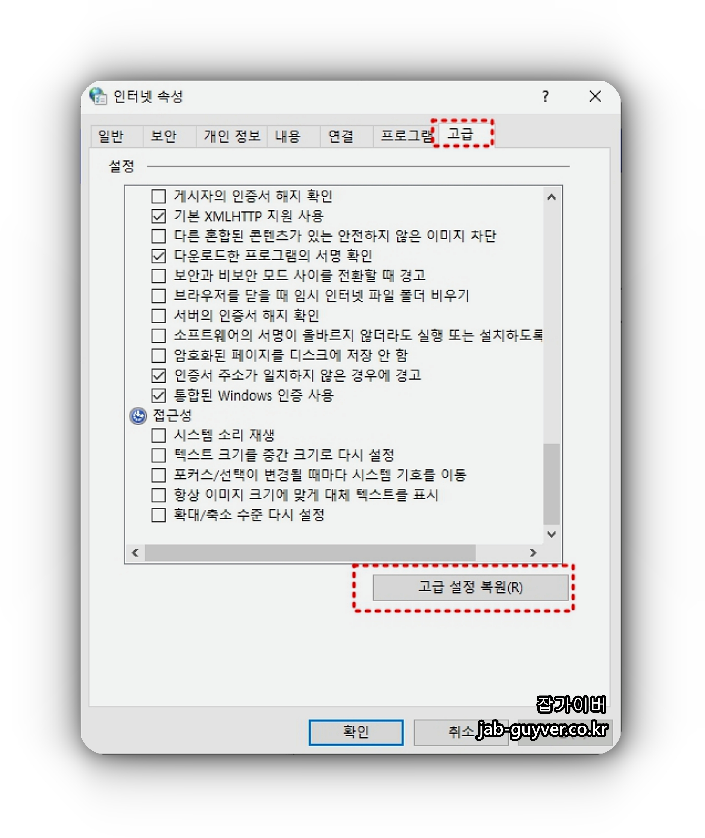 윈도우7 사용자라면 제어판으로 들어가 인터넷 옵션에서 고급 -> 고급설정 복원으로 설정값을 복구합니다.
