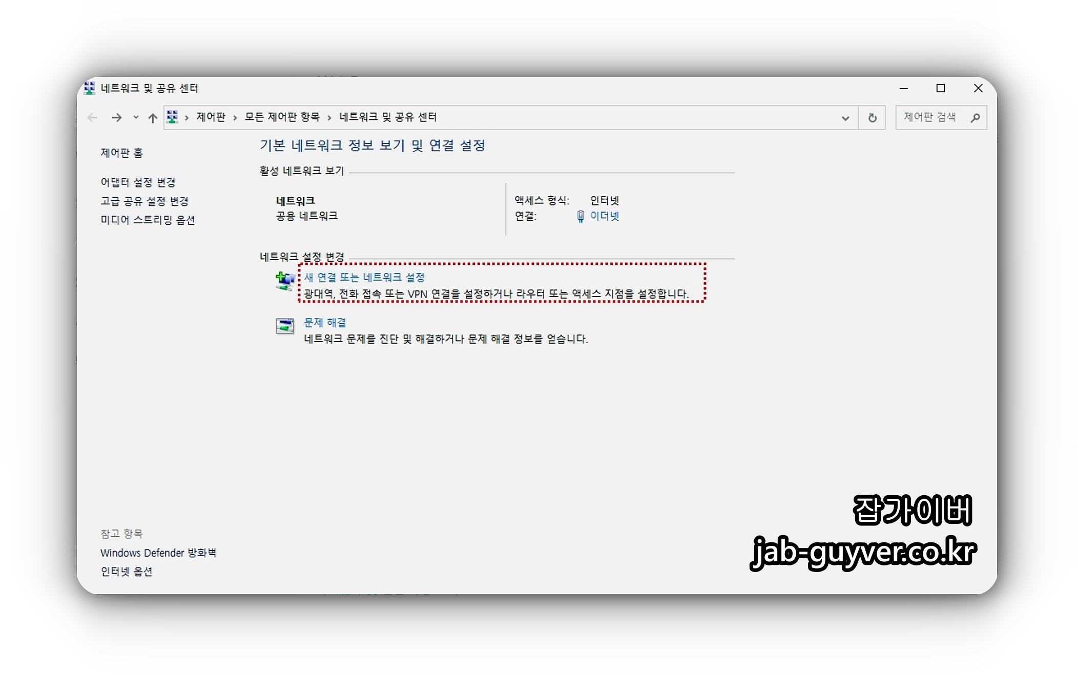 제어판 -> 모든 제어판  항목 -> 네트워크 및 공유센터에서 네트워크 설정변경 항목을 보면 새 연결 또는 네트워크 설정이 있습니다.