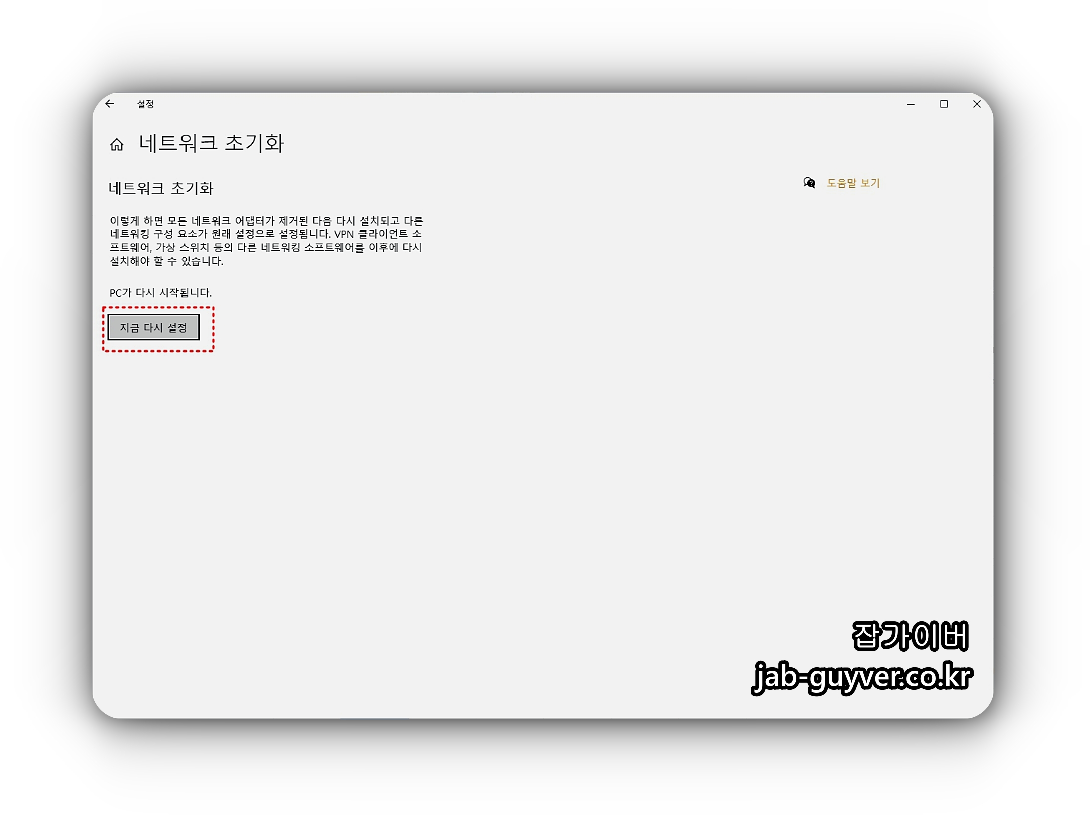 네트워크 초기화 지금 다시 설정을 통해 네트워크 라우터 어댑터의 모든 설정을 리셋합니다.