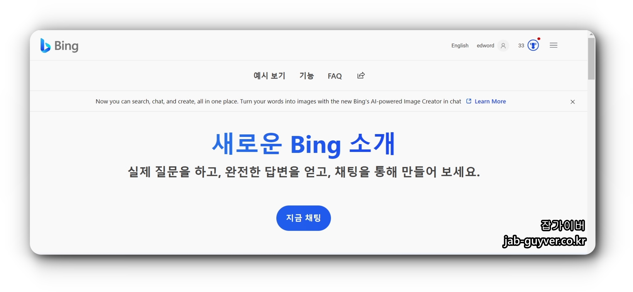 다음 빙 NEW 검색엔진으로 들어가면 2023년 4월부터는 별도의 대기신청 없이 바로 BING AI검색을 사용할 수 있습니다.
