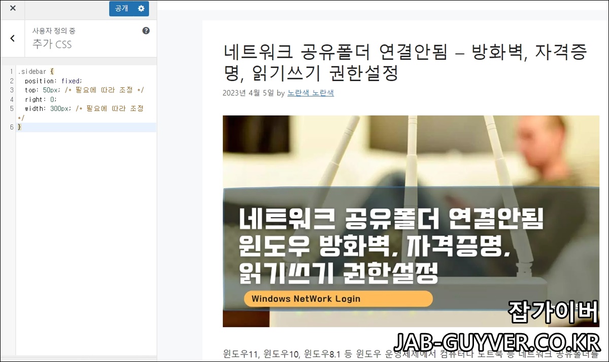 먼저 사이드바 고정은 테마의 style.css를 직접 편집하거나, 워드프레스 관리자에서 [테마 → 사용자 정의하기 → 추가 CSS] 메뉴를 이용해 CSS를 추가하는 방식으로 적용할 수 있다.