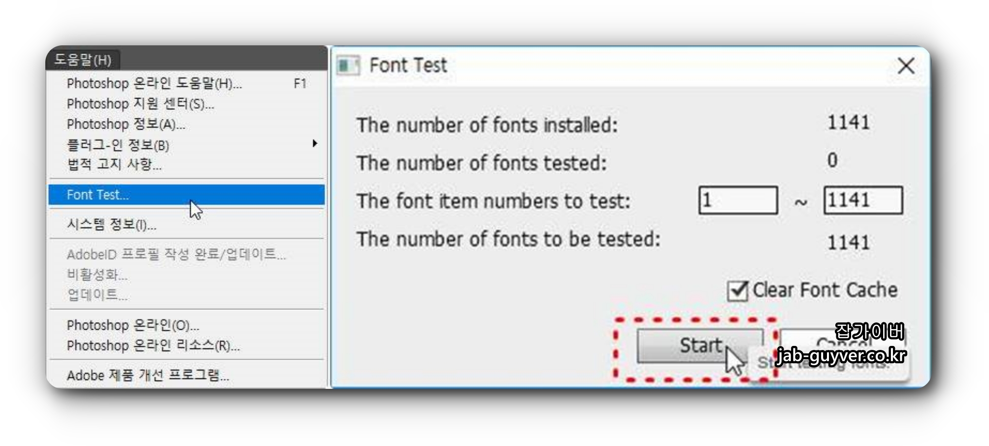움말 -> Font Test를 선택합니다. 현재 설치된 포토샵 폰트의 갯수 나오는데 여기서 Start 버튼을 눌러 모든 포토샵 폰트를 재생성해서 포토샵 폰트오류를 해결합니다.