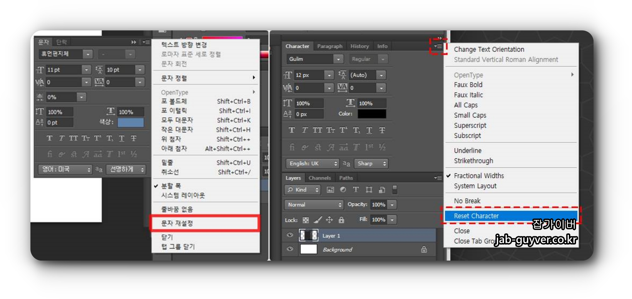 포토샵 실행 후 -> 메뉴 -> Winodws -> Character