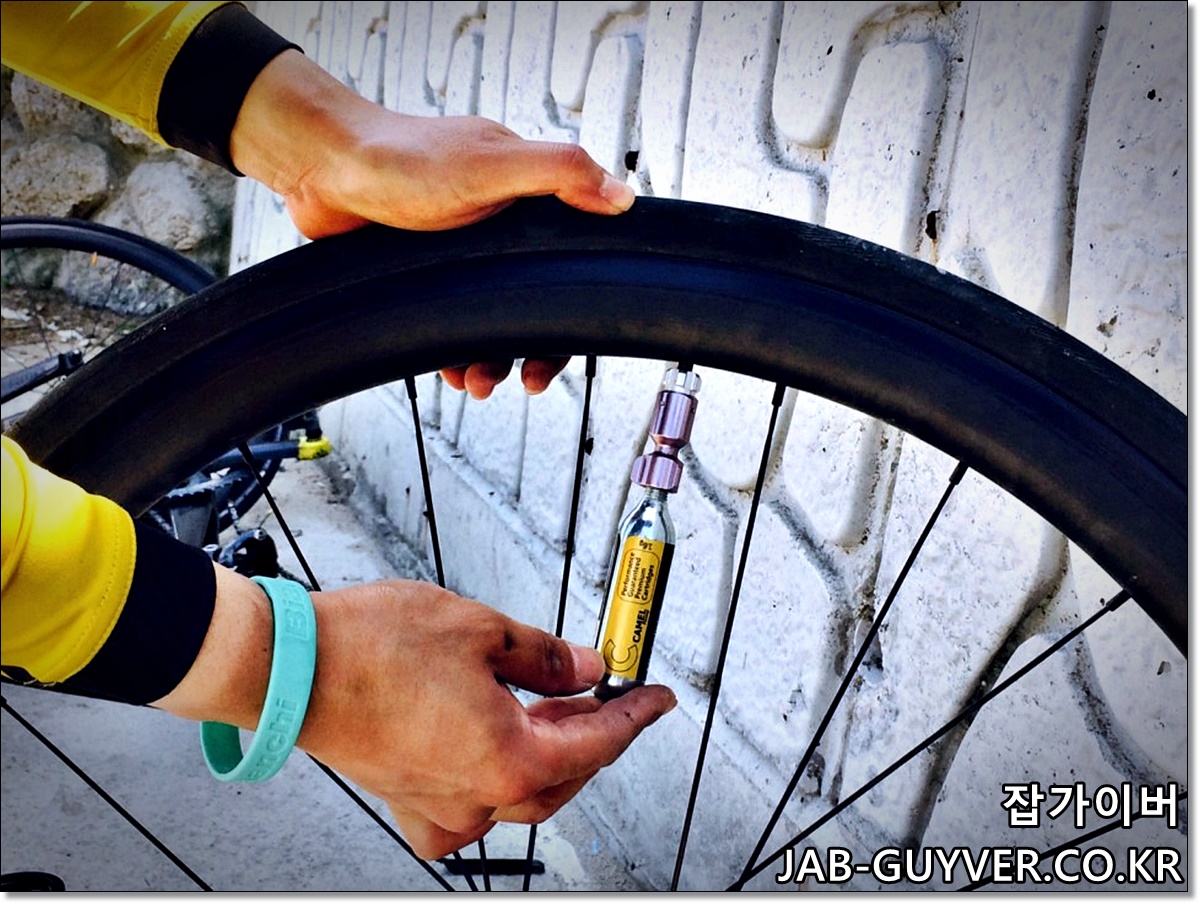 이후 튜브와 타이어를 다시 장착하며 이때 튜브가 씹히지 않도록 주의하며 co2나 펌프등을 통해 바람을 넣어줍니다.