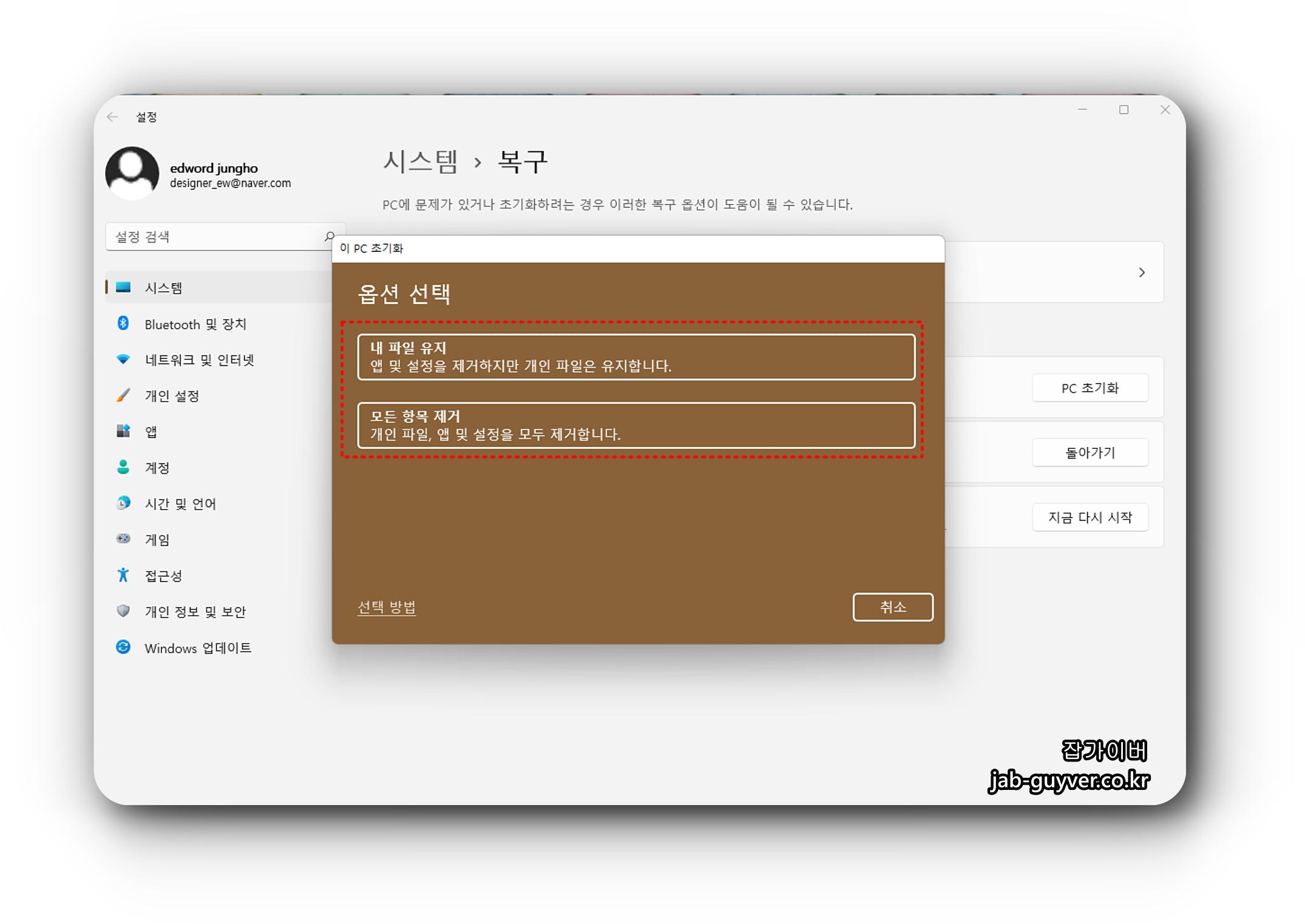 윈도우 시스템 -> 복구옵션에서 이 PC 초기화를 선택합니다.