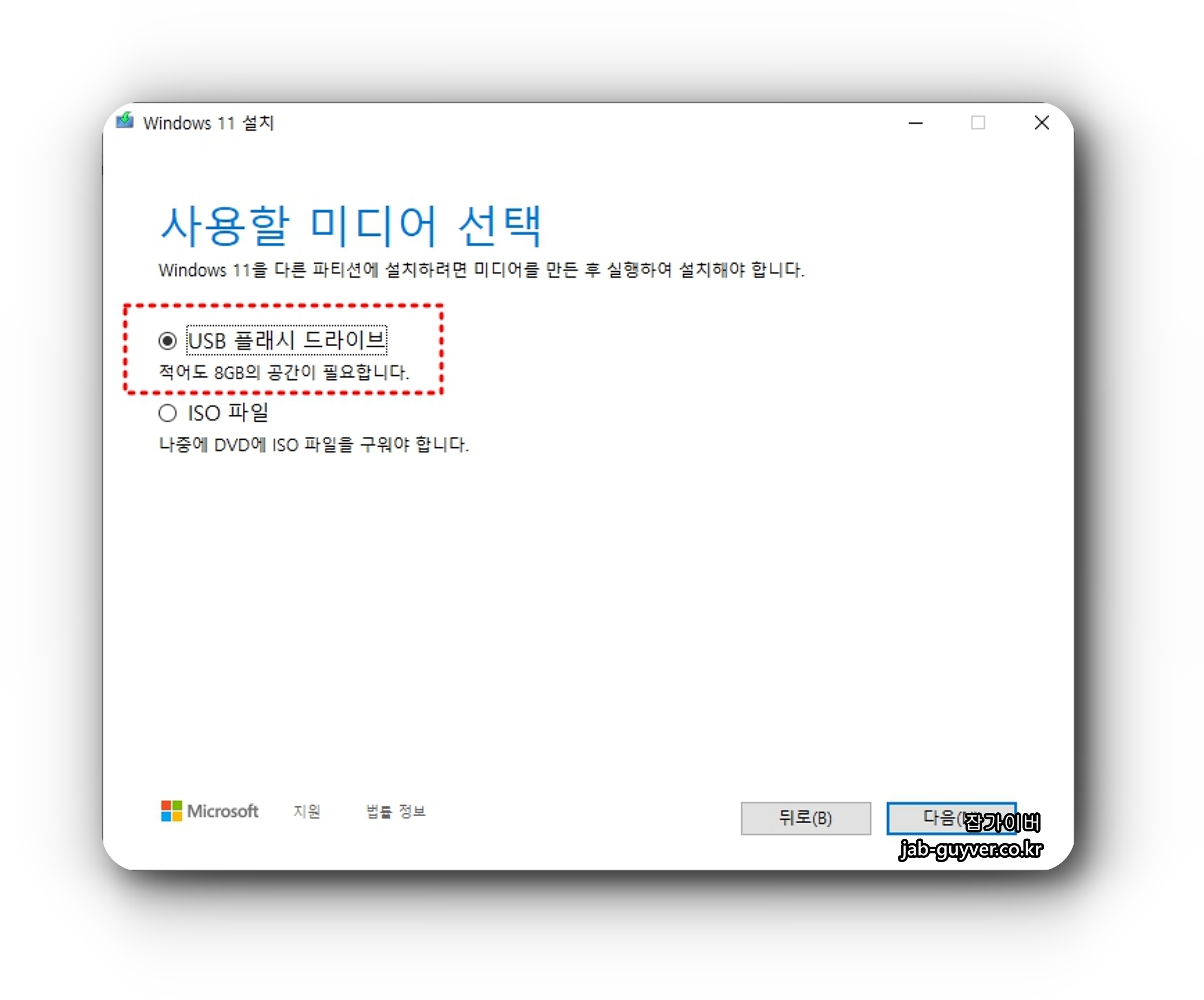 사용할 미디어로 USB플래시 드라이브를 선택하면 USB 부팅이 가능한 윈도우 설치파일이 만들어집니다.