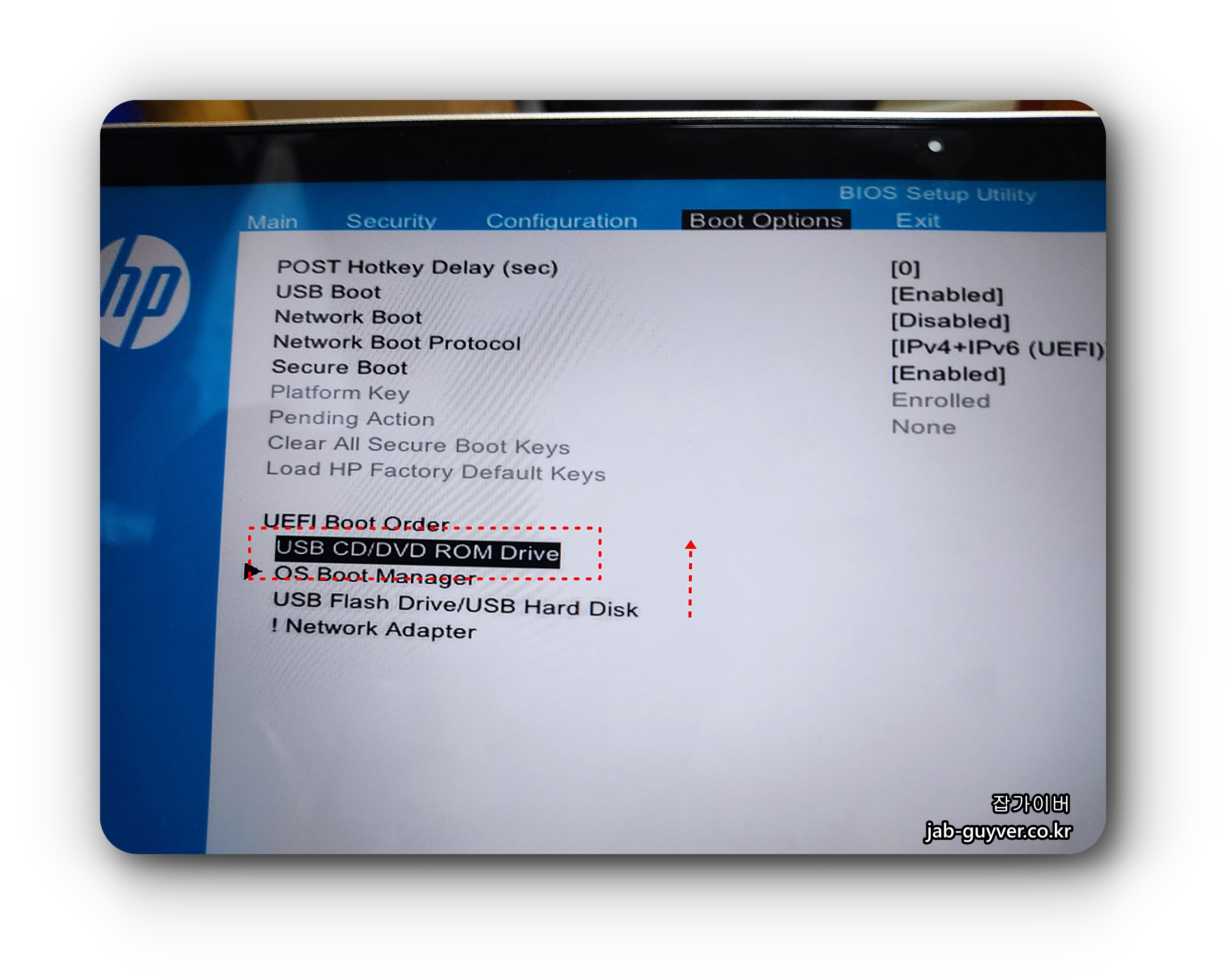 이후 컴퓨터 및 노트북을 부팅디스크 삽입 후 재부팅하며 부팅옵션에서 UEFI Boot Order에서 부팅순서를 USB를 가장 먼저 부팅되도록 설정합니다.