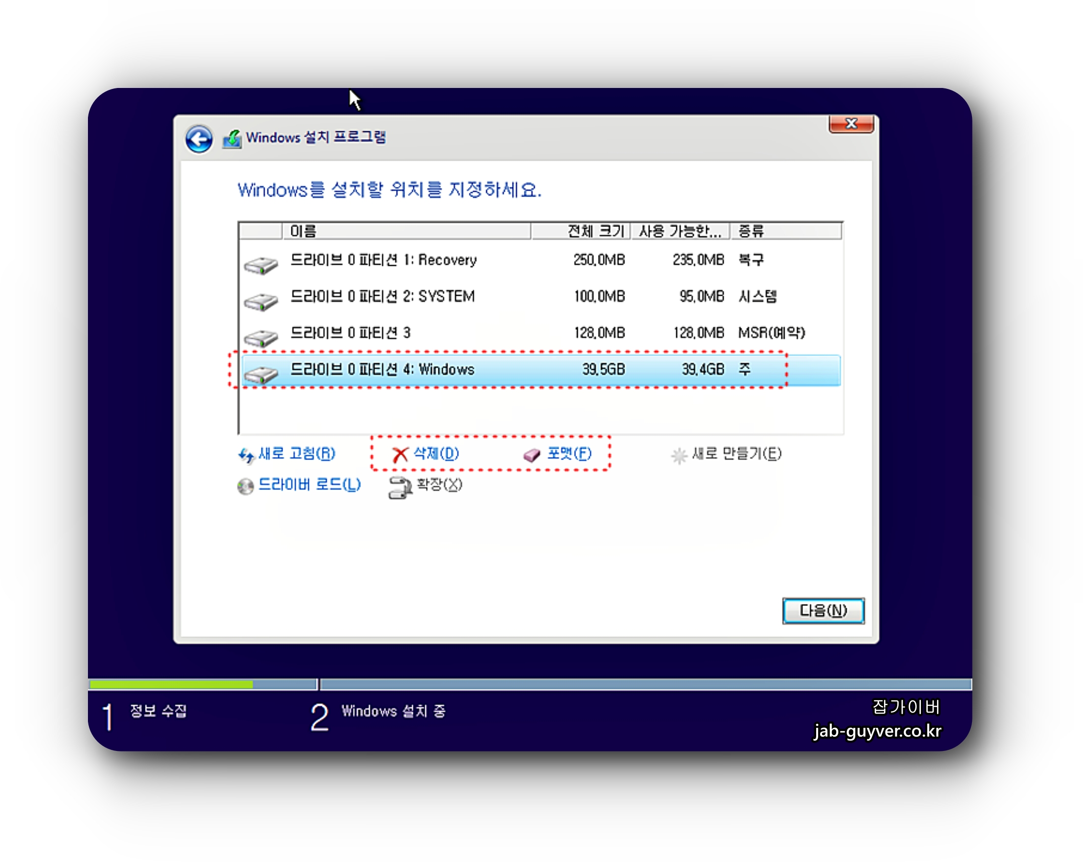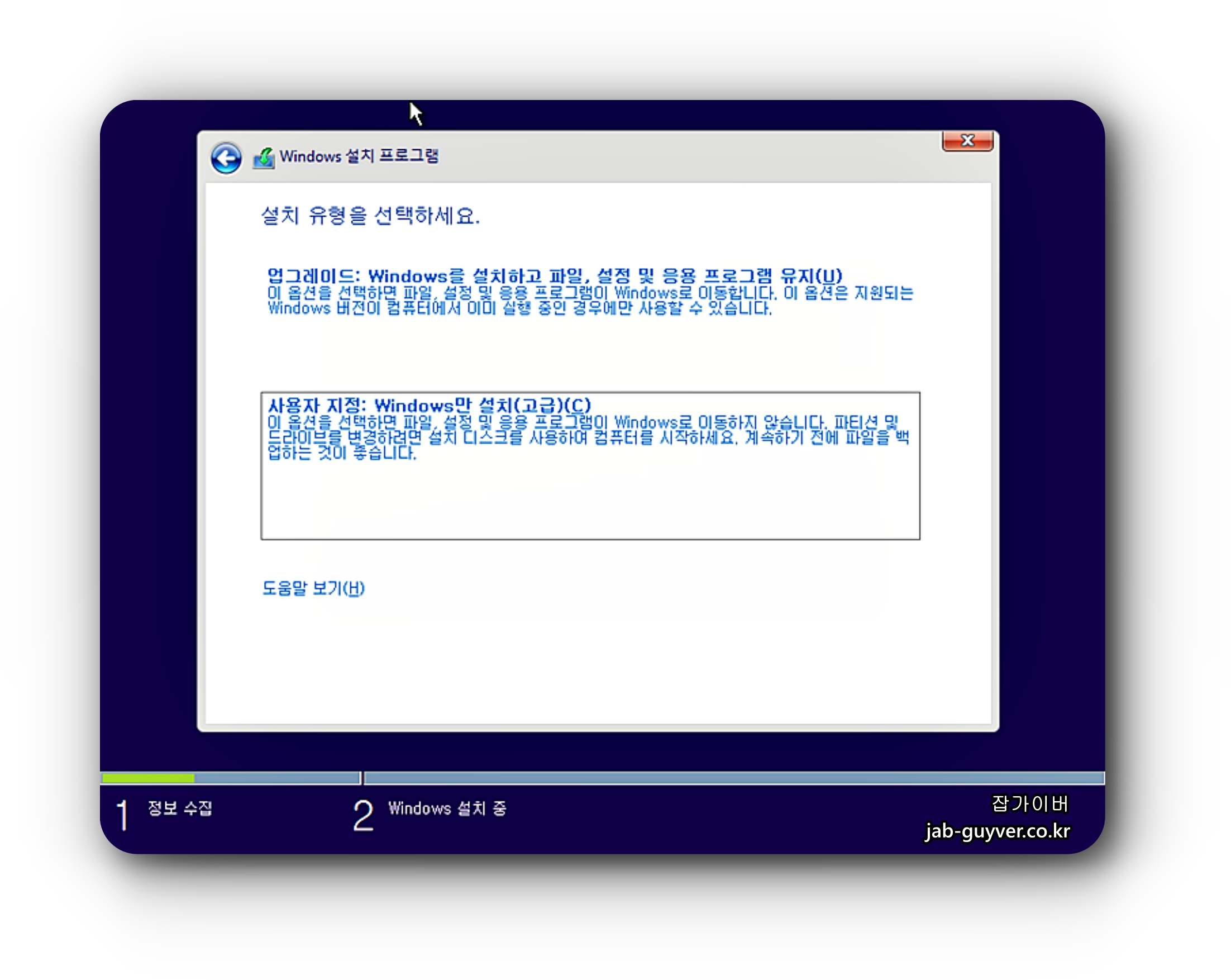 윈도우 설치 유형에서 업그레이드를 선택하면 안됩니다.